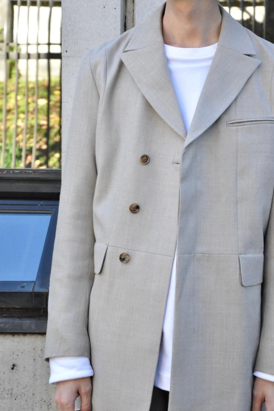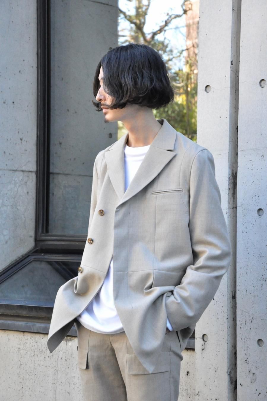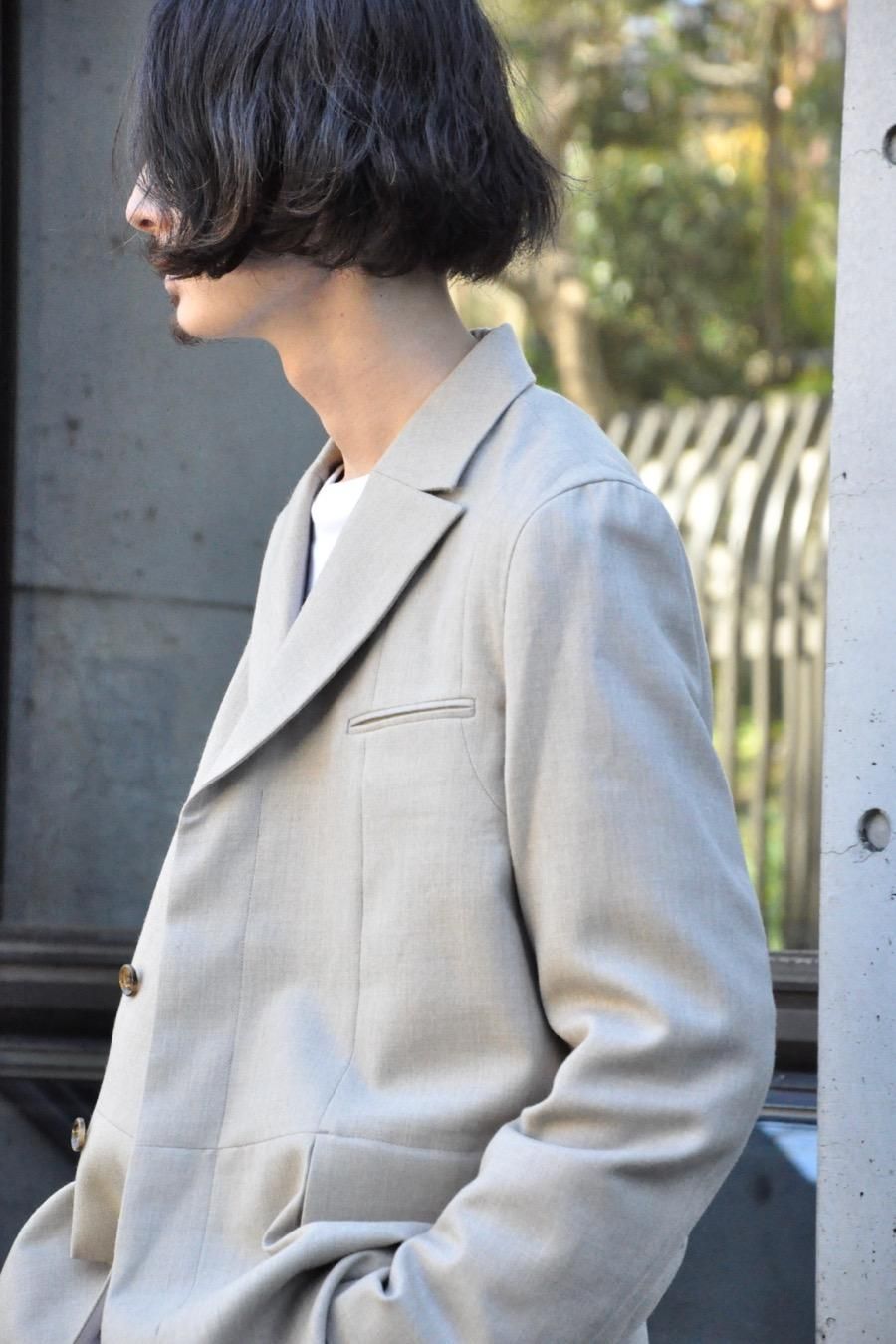 比翼仕立てにしたダブルジャケット。 フラップを兼ねたヨークによって、前身頃をスッキリとさせています。 後ろ身頃にはダーツを施し、シェイプをさせ、深くベントをとっています。 タイト~ジャストなサイズ、ややロングの丈。 生地には綾目の強いウールを使用し、立体的なシルエットを作っています。