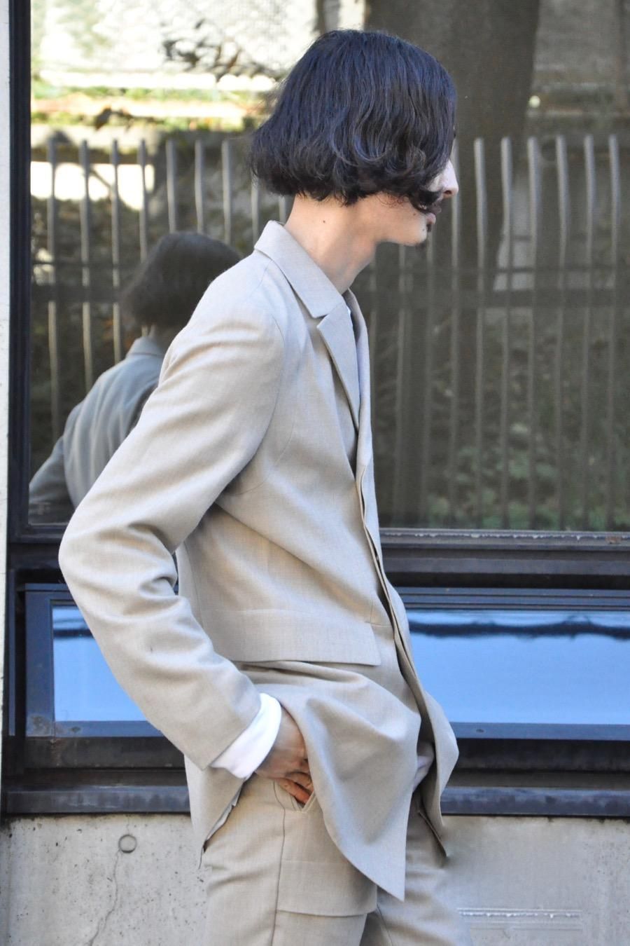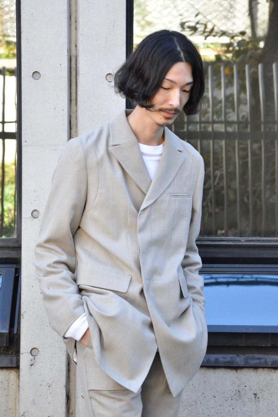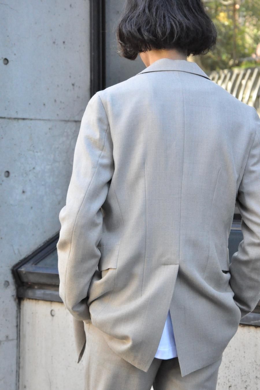 比翼仕立てにしたダブルジャケット。 フラップを兼ねたヨークによって、前身頃をスッキリとさせています。 後ろ身頃にはダーツを施し、シェイプをさせ、深くベントをとっています。 タイト~ジャストなサイズ、ややロングの丈。 生地には綾目の強いウールを使用し、立体的なシルエットを作っています。