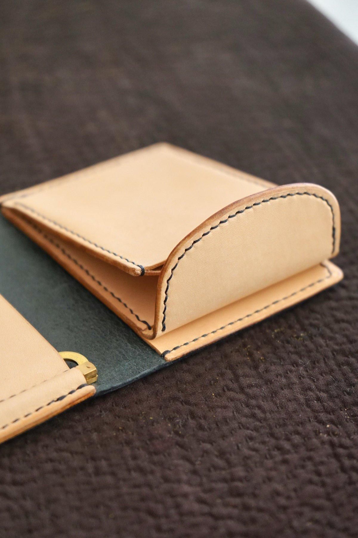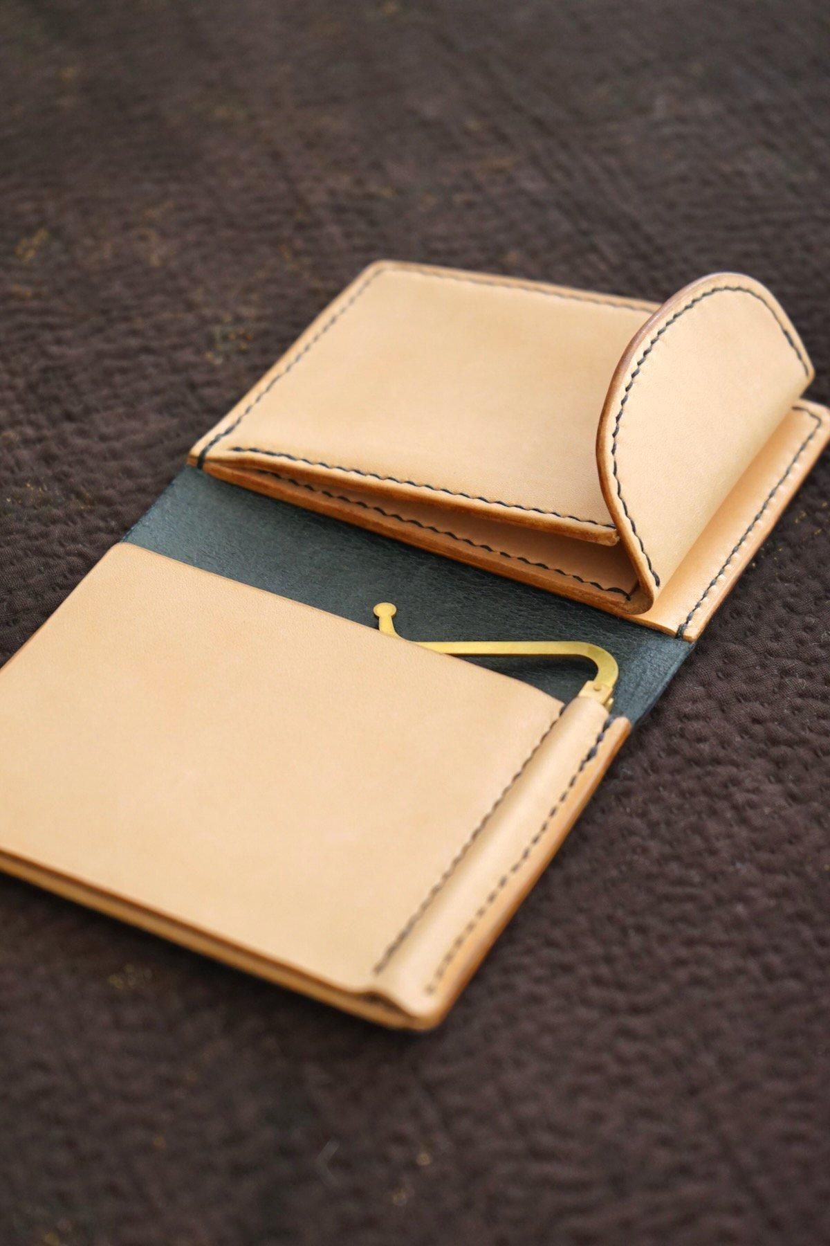真鍮製のマネークリップを使用したレザーウォレット。ポケットに入れて持ち歩くのに最適なコンパクトサイズです。マネークリップの裏に1箇所、コインケースの裏に2箇所カード収納スペースがございます。永く使っていただけるよう、コインケースのフラップからは故障の原因となりやすいボタンをあえて省略しました。