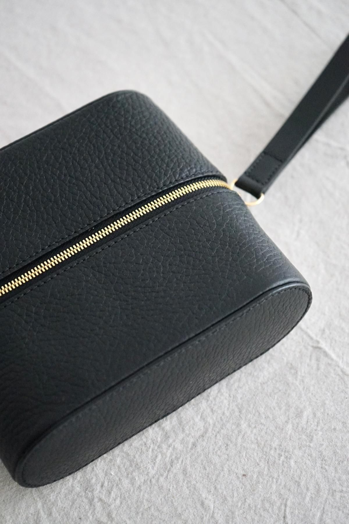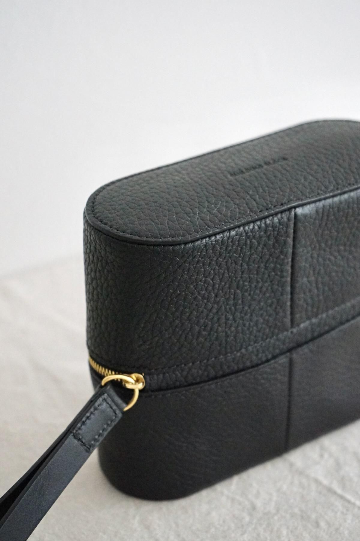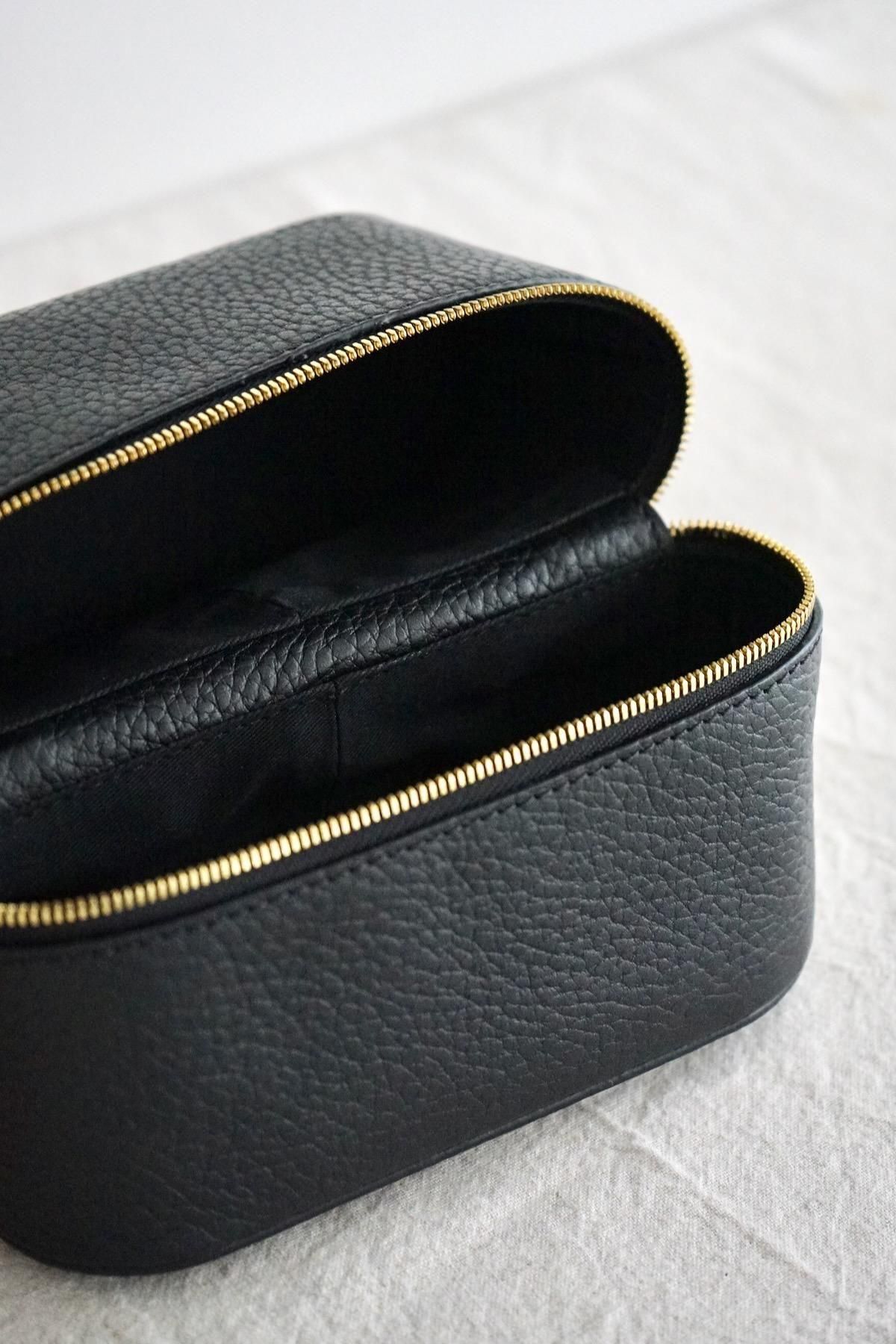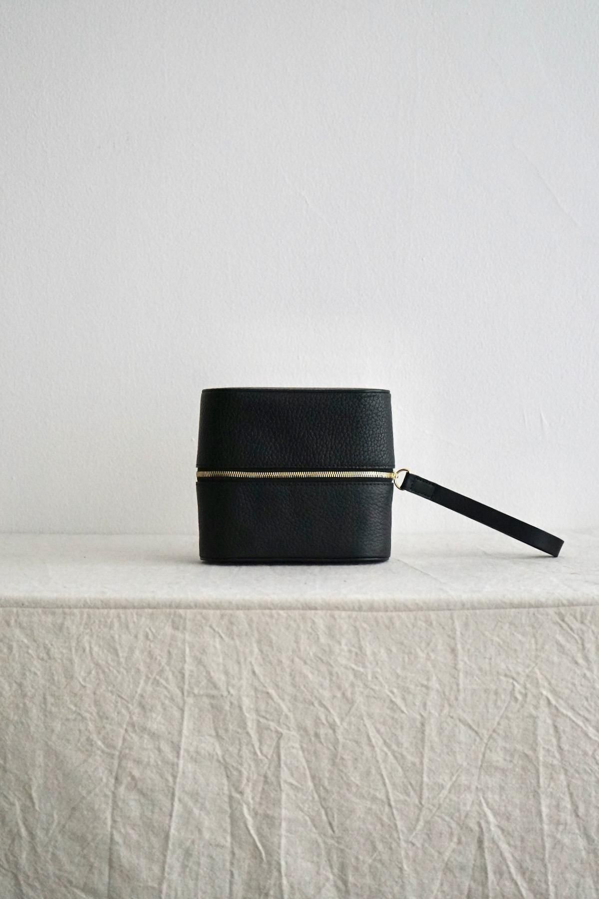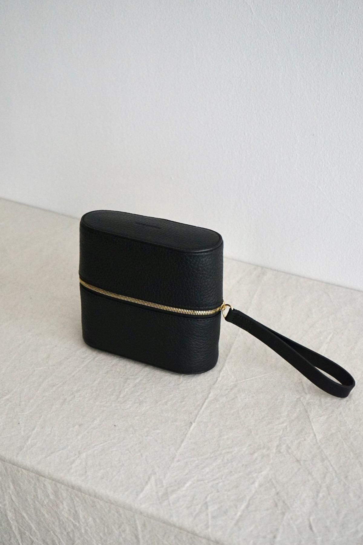 MATERIAL: Pebbled Black leather body with silver zip closure., Opens to split in half.