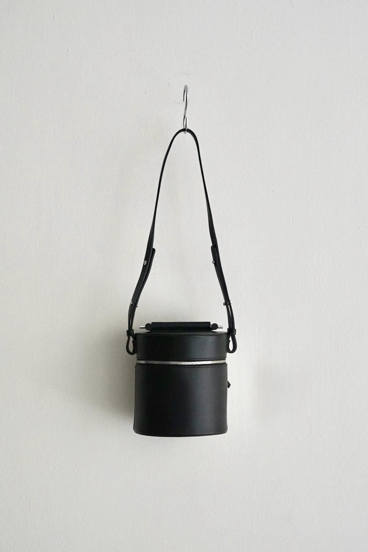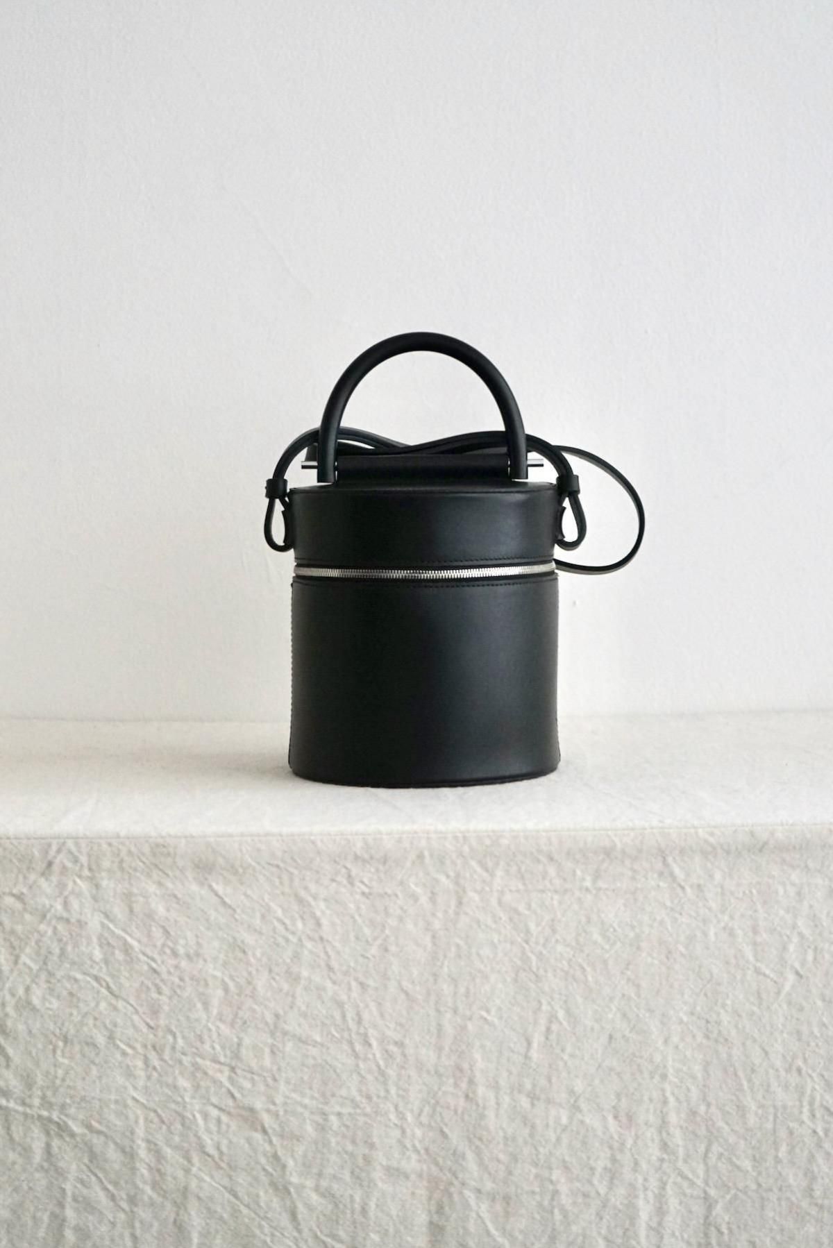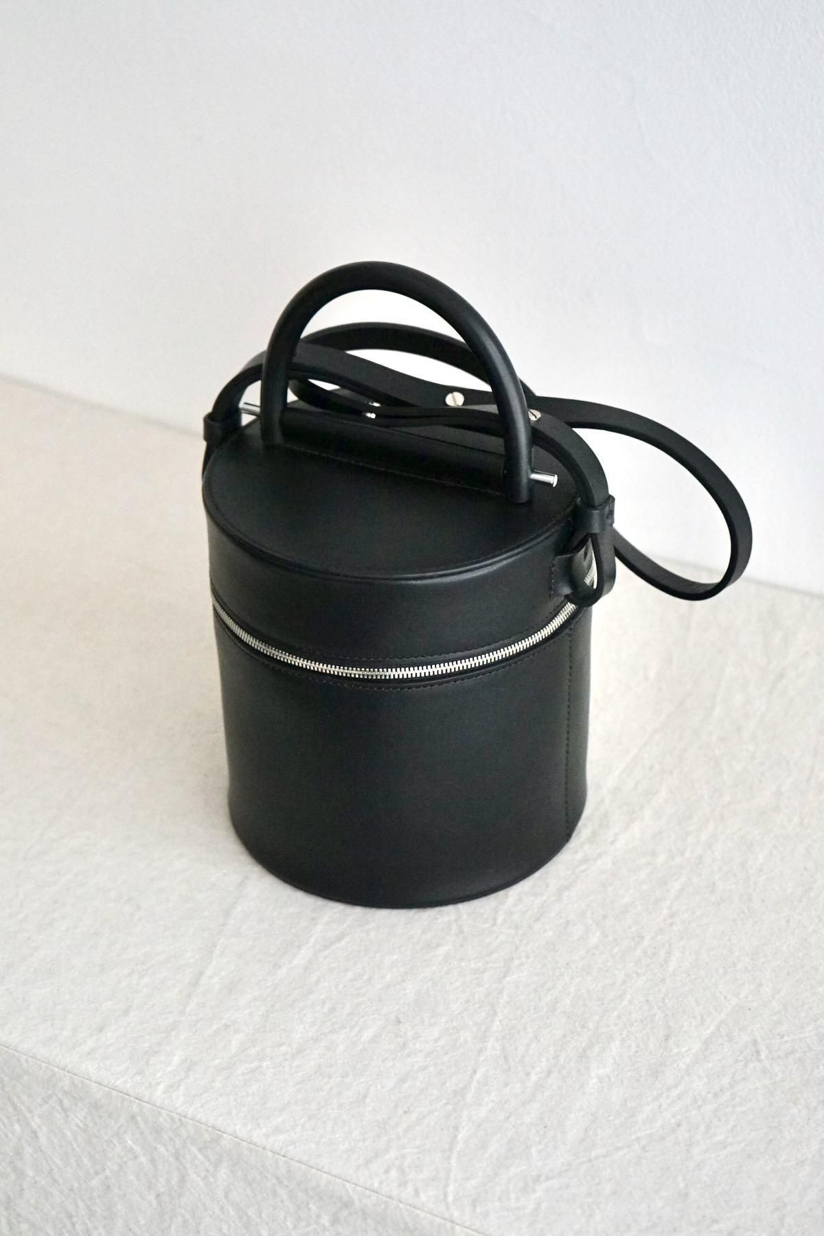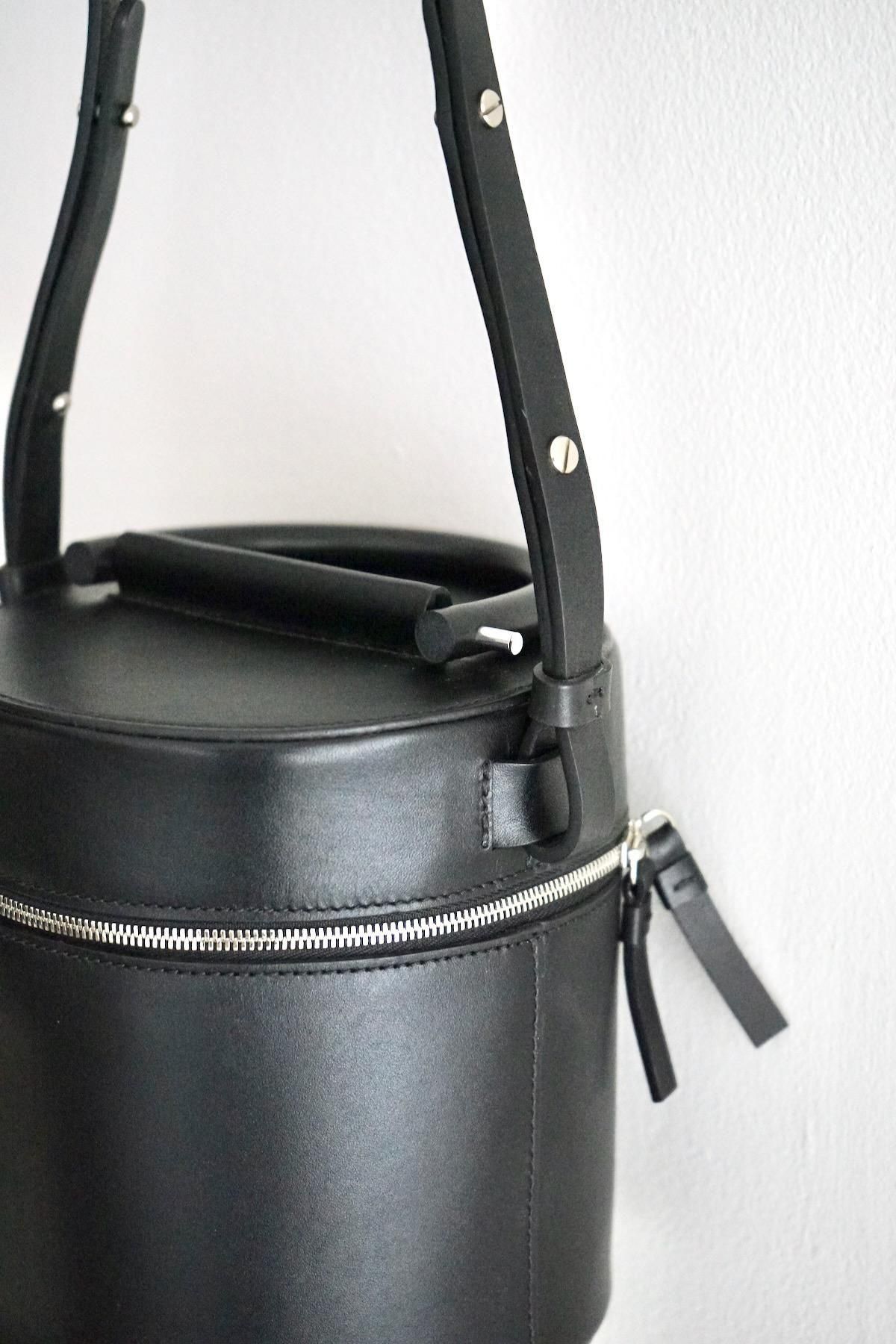 MATERIAL: Structural cylindrical drum bag, Smooth black leather, Double zipper