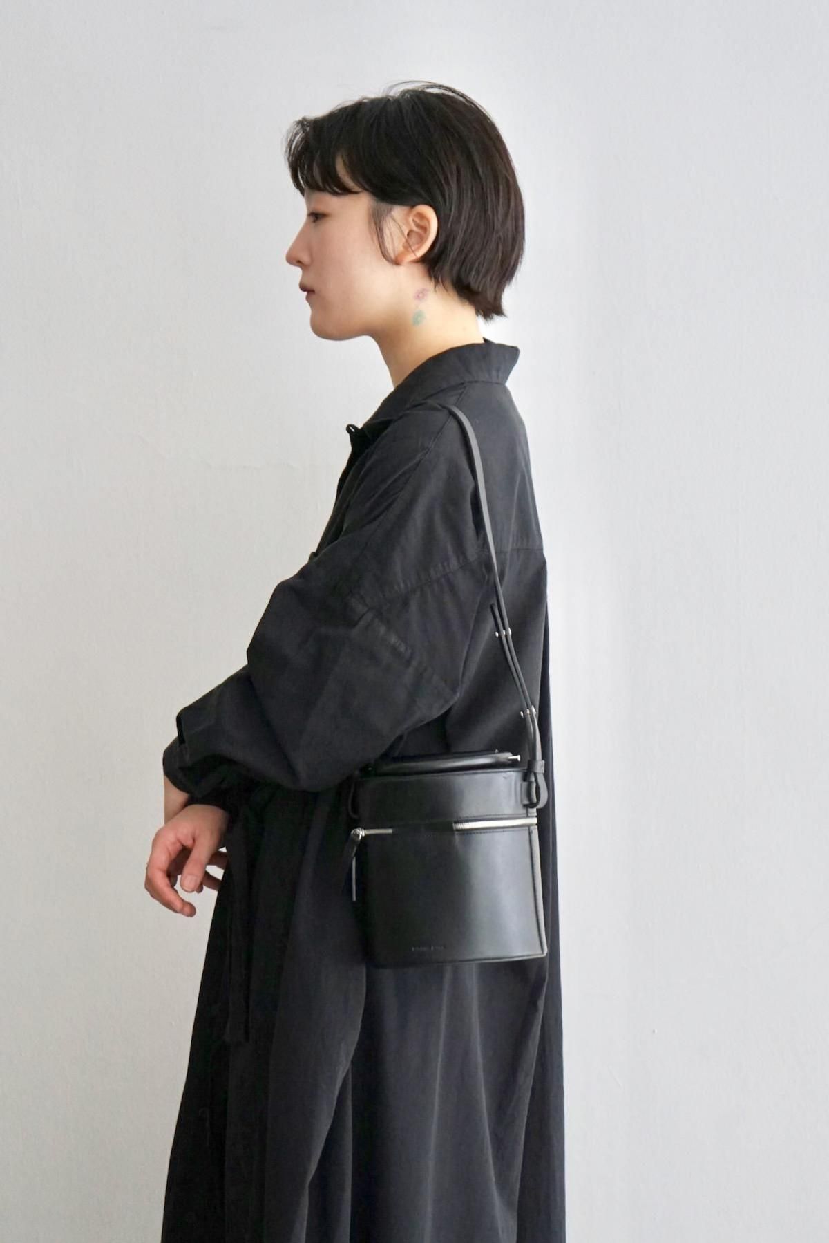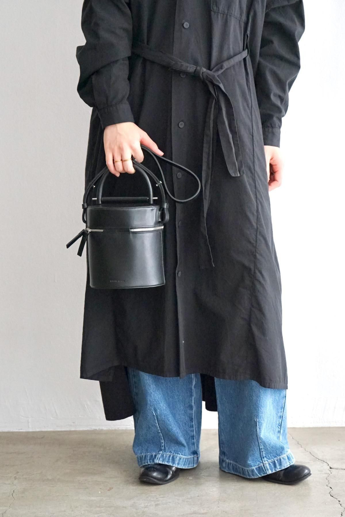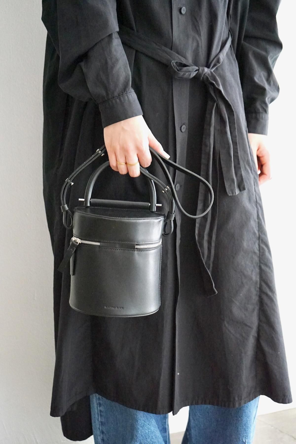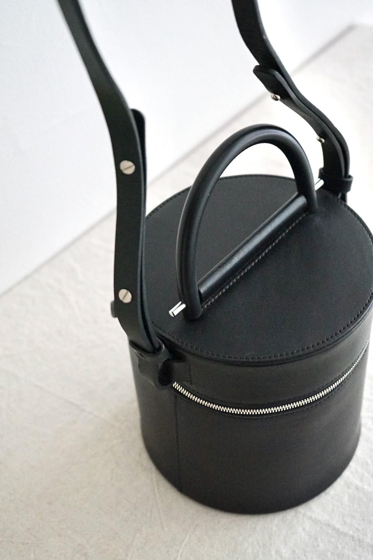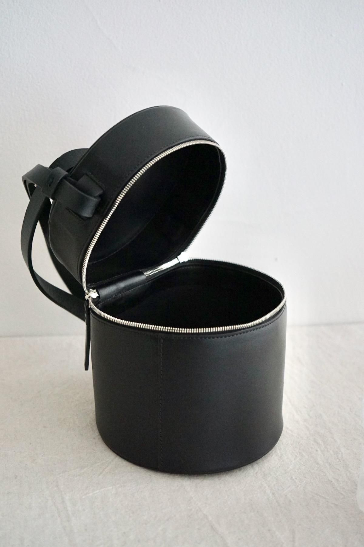 MATERIAL: Structural cylindrical drum bag, Smooth black leather, Double zipper