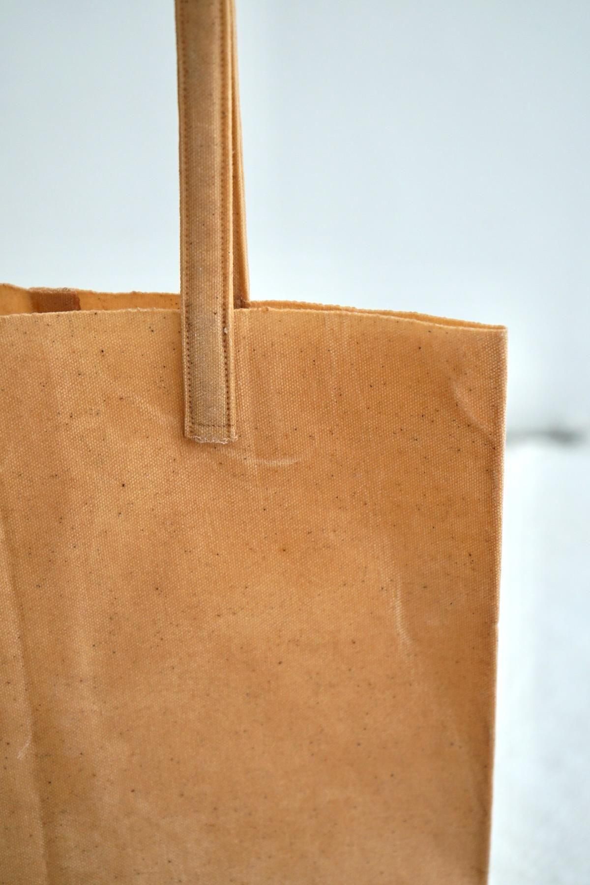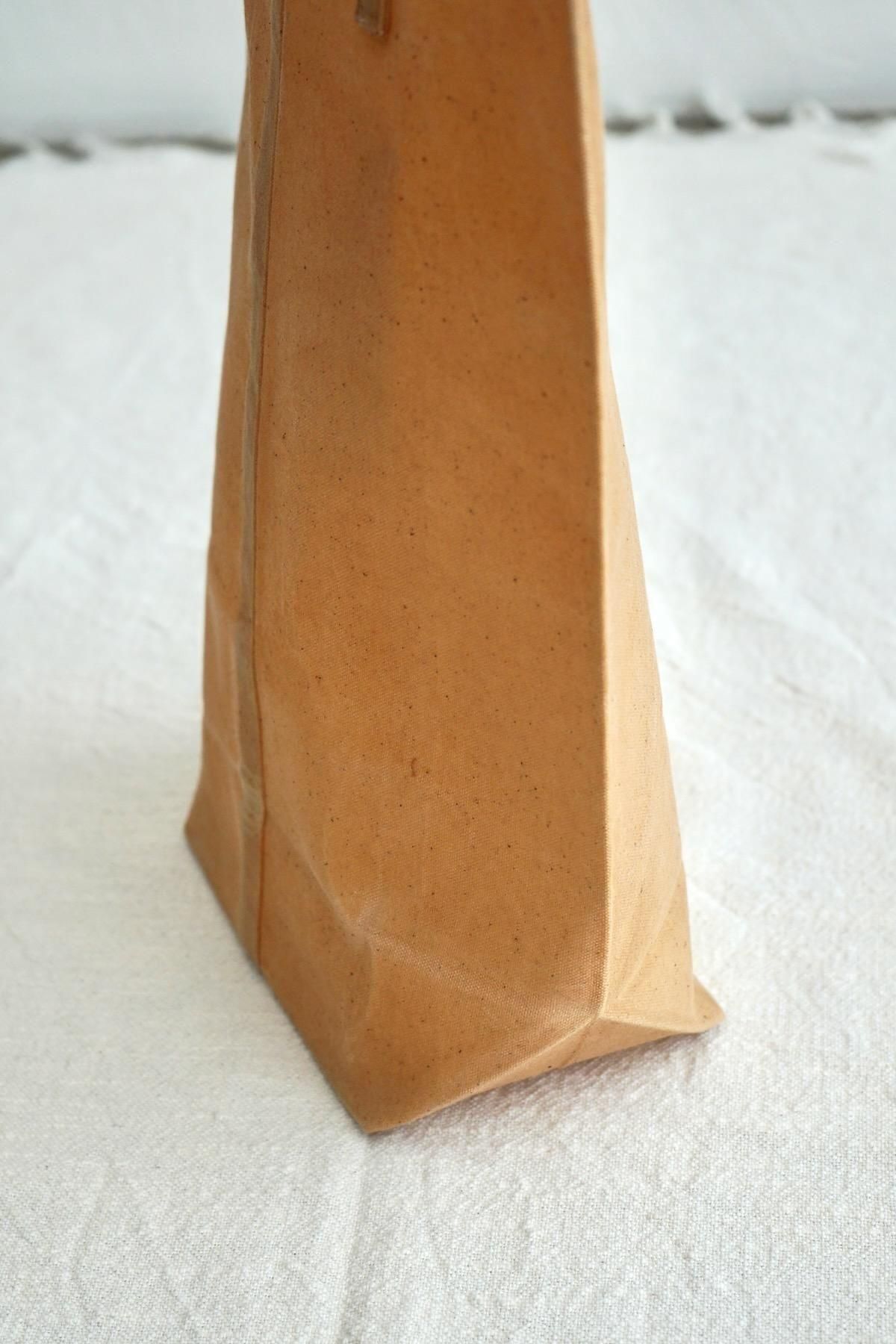 クラフト紙でできた紙袋がインスピレーション源となっており、その質感と風合いを、永く愛用できる素材で再現しようと生まれた作品で