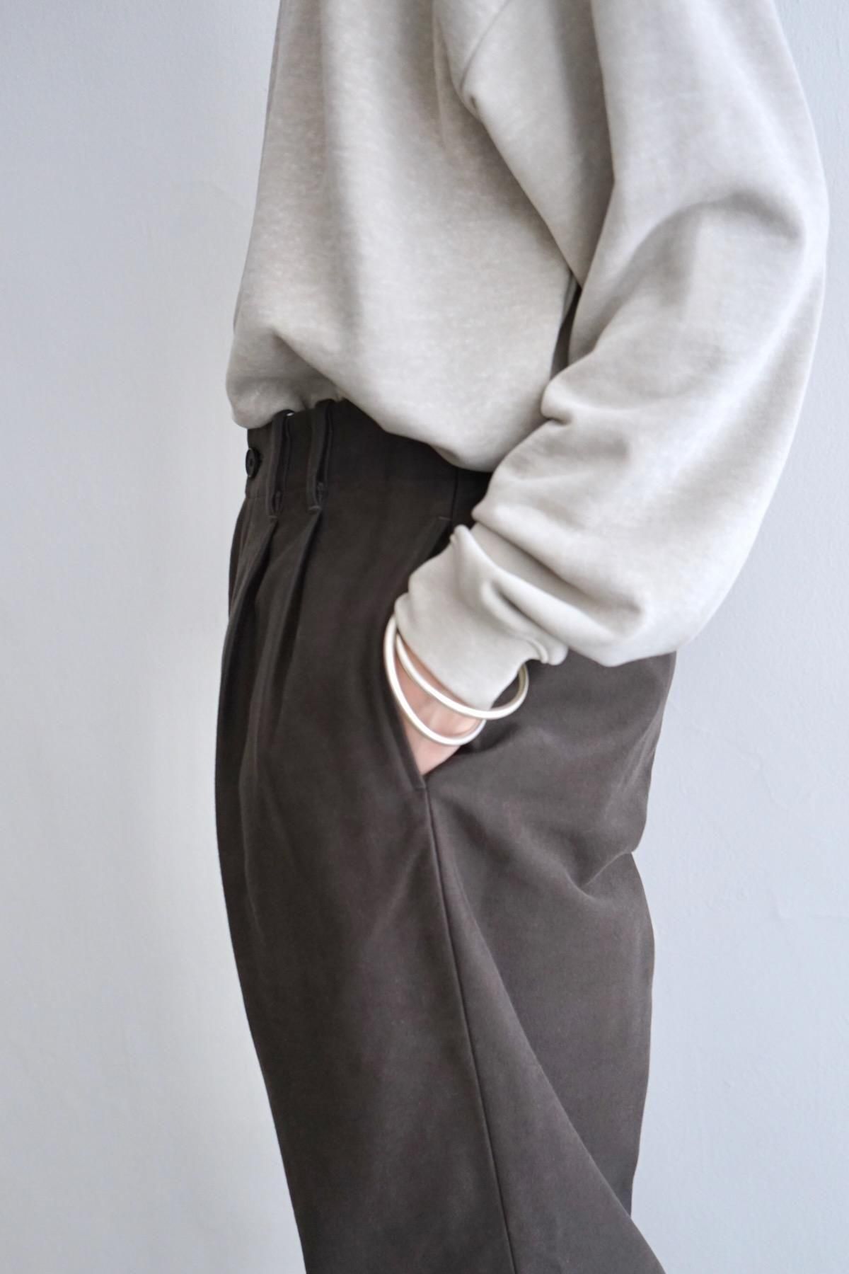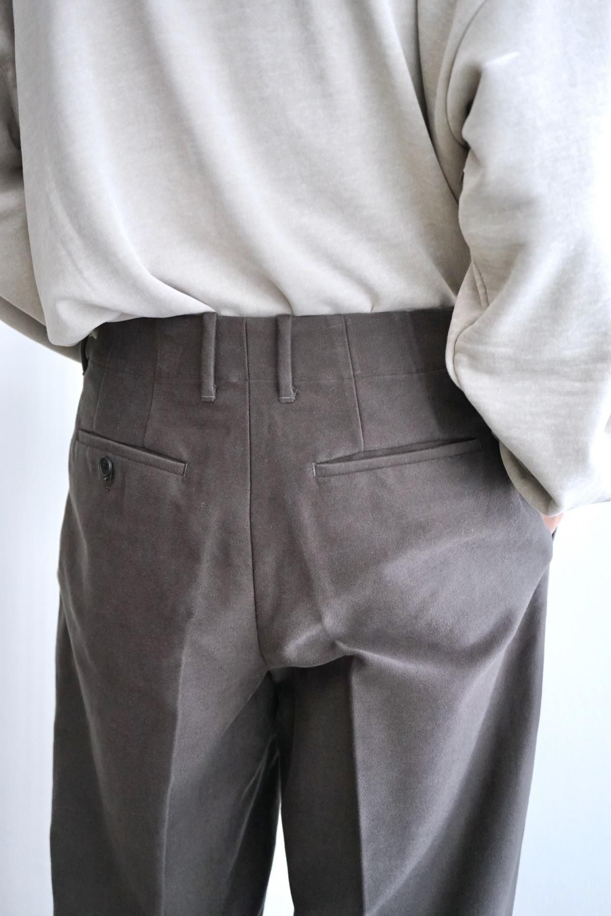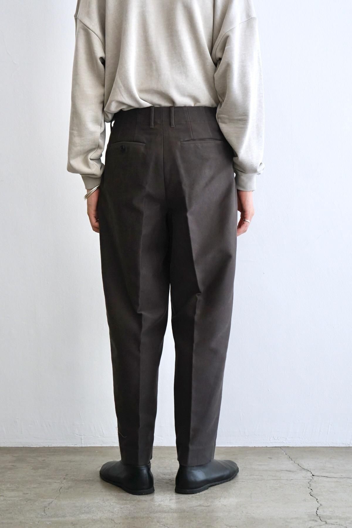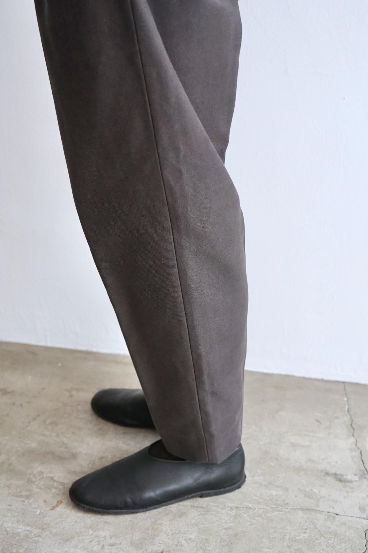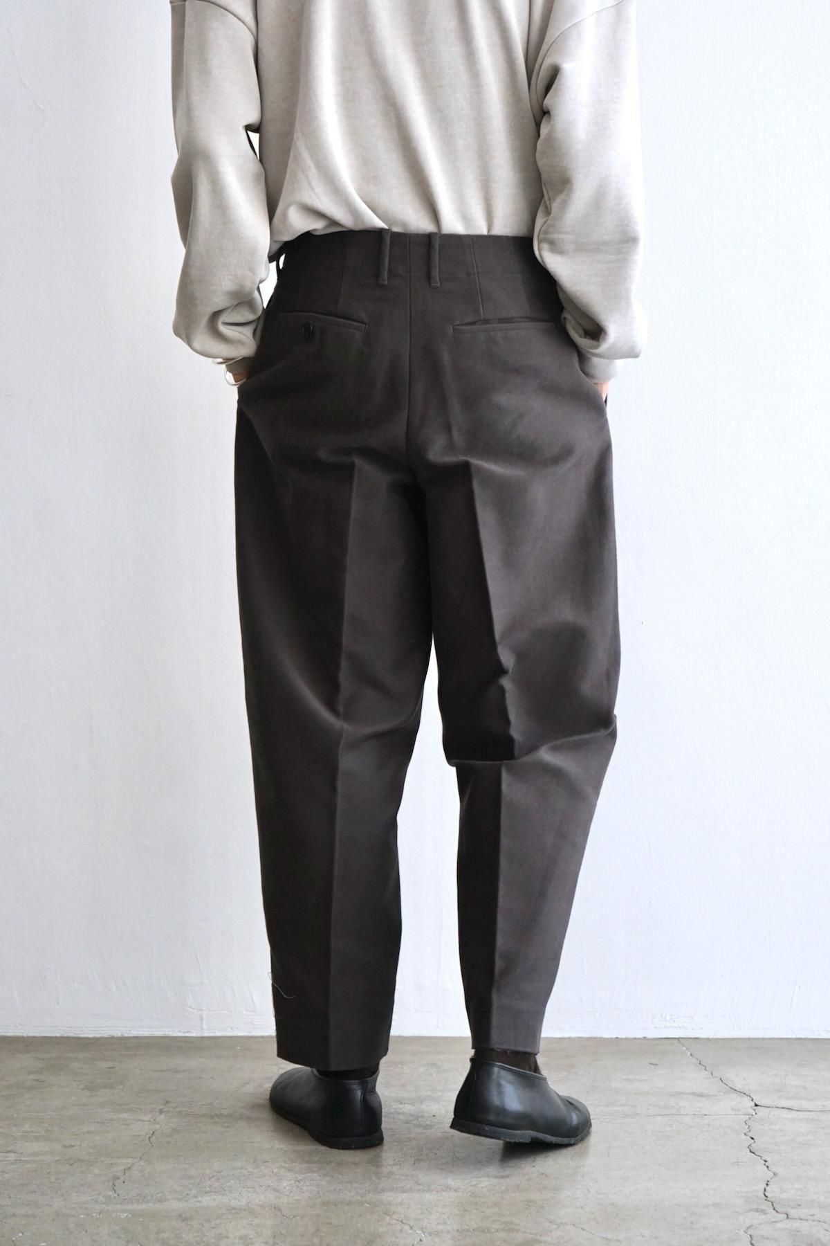 大きく取られた股上と度りの分量を極端にテーパードさせたシルエットで、立体感がとても際立ち、素材本来の持ち味を楽しめる1着となっております。
