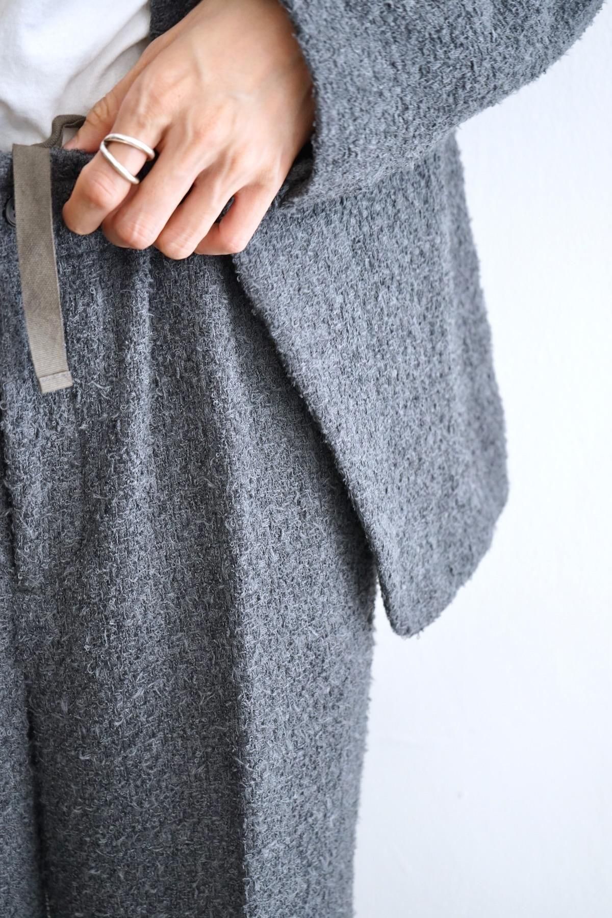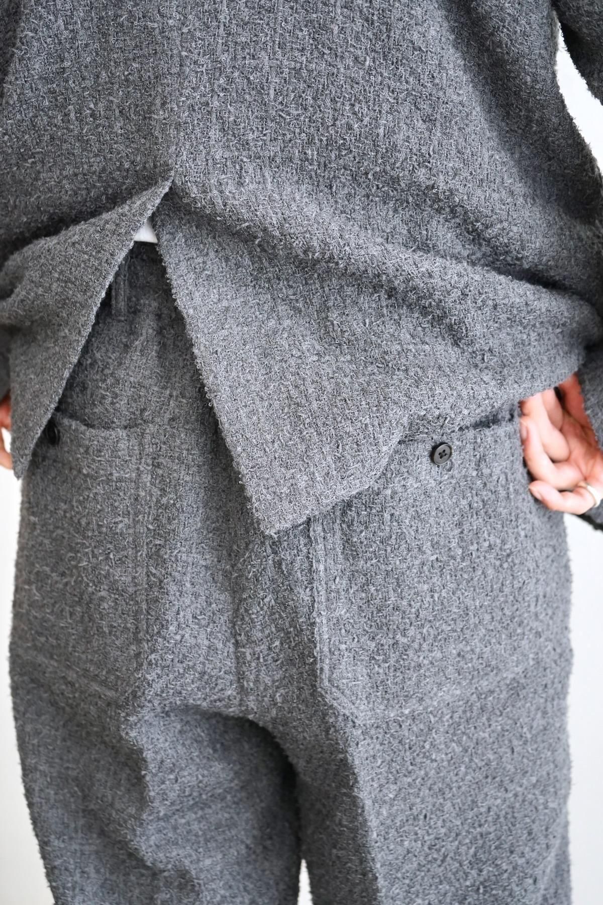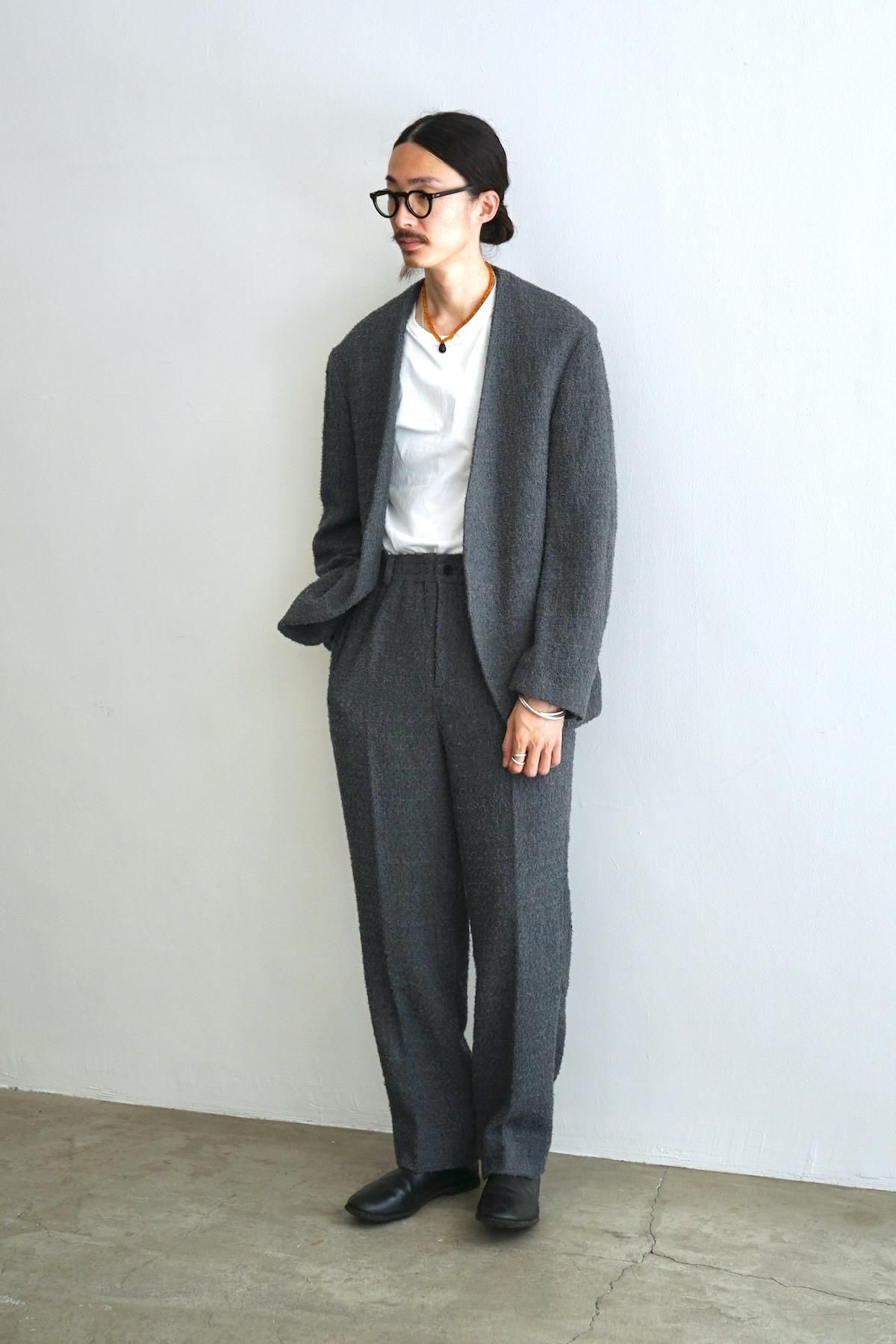 毛羽立ちが少ない、ウール100%の梳毛にすることで4シーズン着れるように考えられています。カラーもオリジナルの霜降りグレーを紡績して頂き、そこから5種類のファンシーヤーンを作成。フリンジの糸や、ノットヤーン、丸胴のチューブ状の糸など、理想とする5種類全てを今回のツイードに織り込み、あえて5種類の糸全てを1色にすることで、無地面の中に奥行きと表情を込めて作られています。