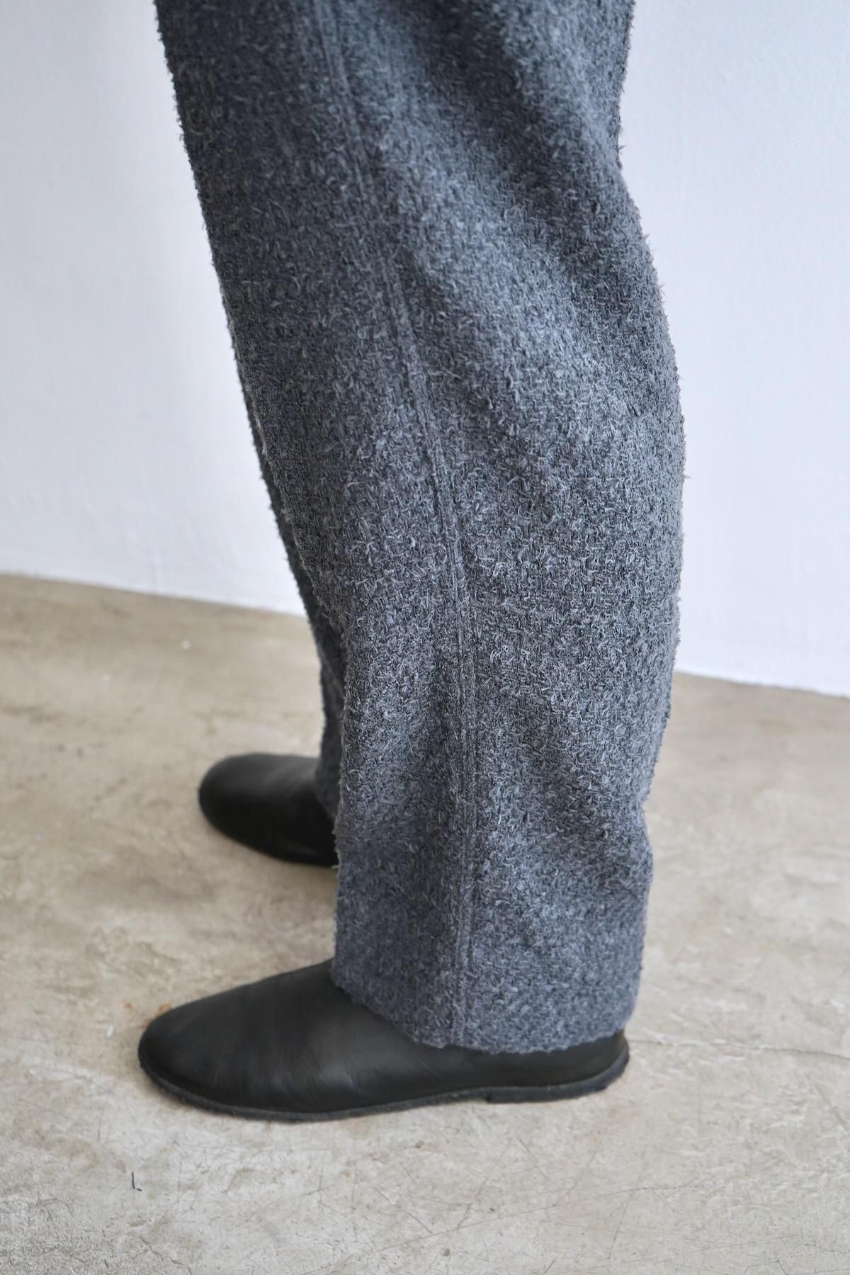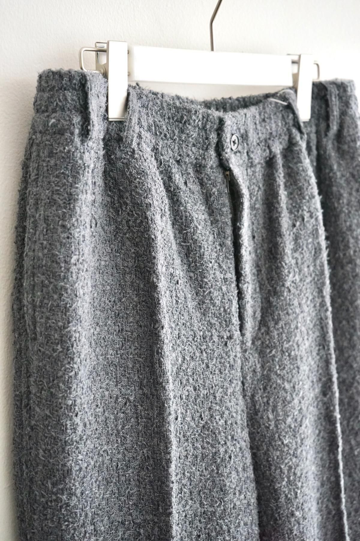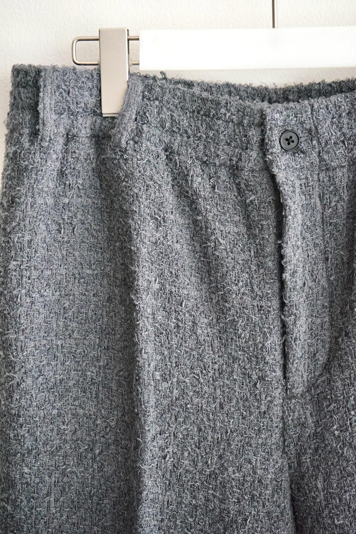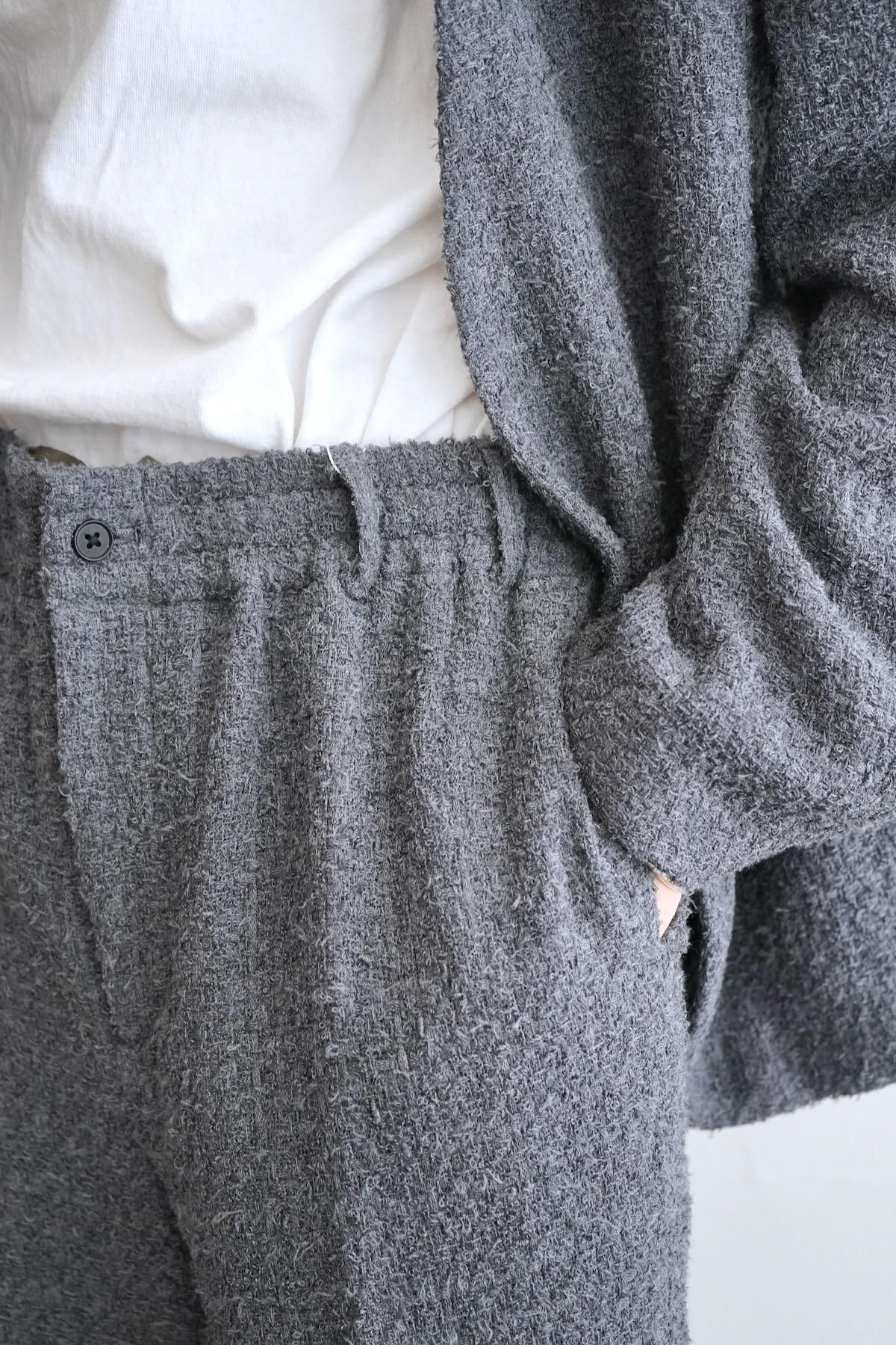 毛羽立ちが少ない、ウール100%の梳毛にすることで4シーズン着れるように考えられています。カラーもオリジナルの霜降りグレーを紡績して頂き、そこから5種類のファンシーヤーンを作成。フリンジの糸や、ノットヤーン、丸胴のチューブ状の糸など、理想とする5種類全てを今回のツイードに織り込み、あえて5種類の糸全てを1色にすることで、無地面の中に奥行きと表情を込めて作られています。