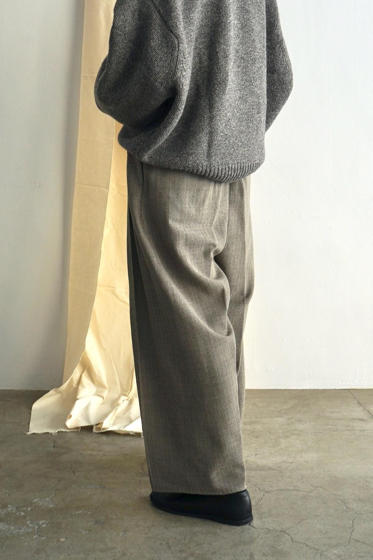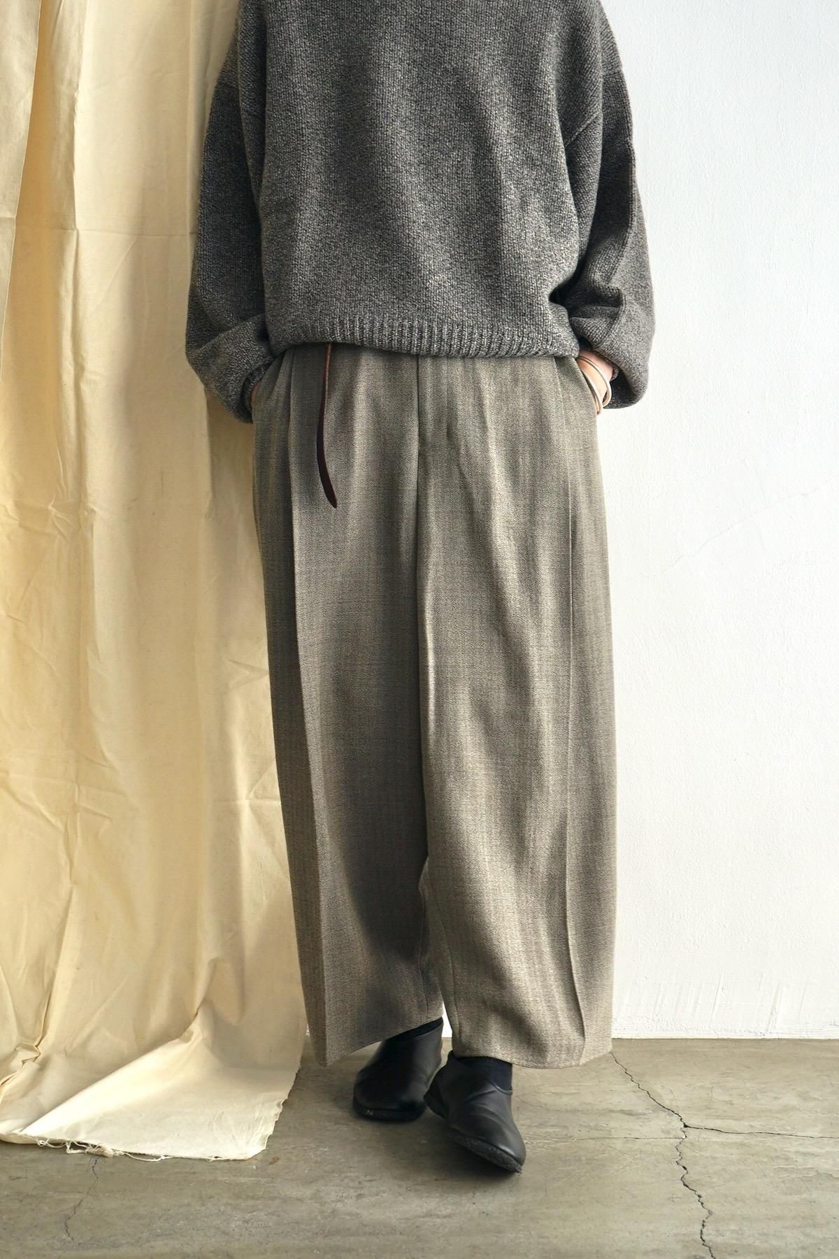 ヘリンボーン組織を手でほぐし、曖昧に散らして自分の理想的なバランスを織りで再現しました。しっかりと打ち込まれた密度に梳毛の糸によるドレープが生まれております。