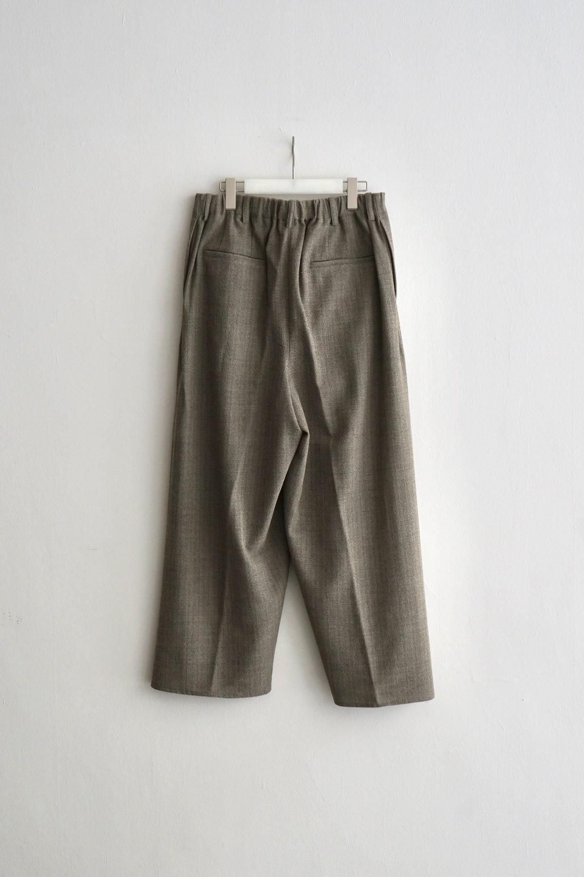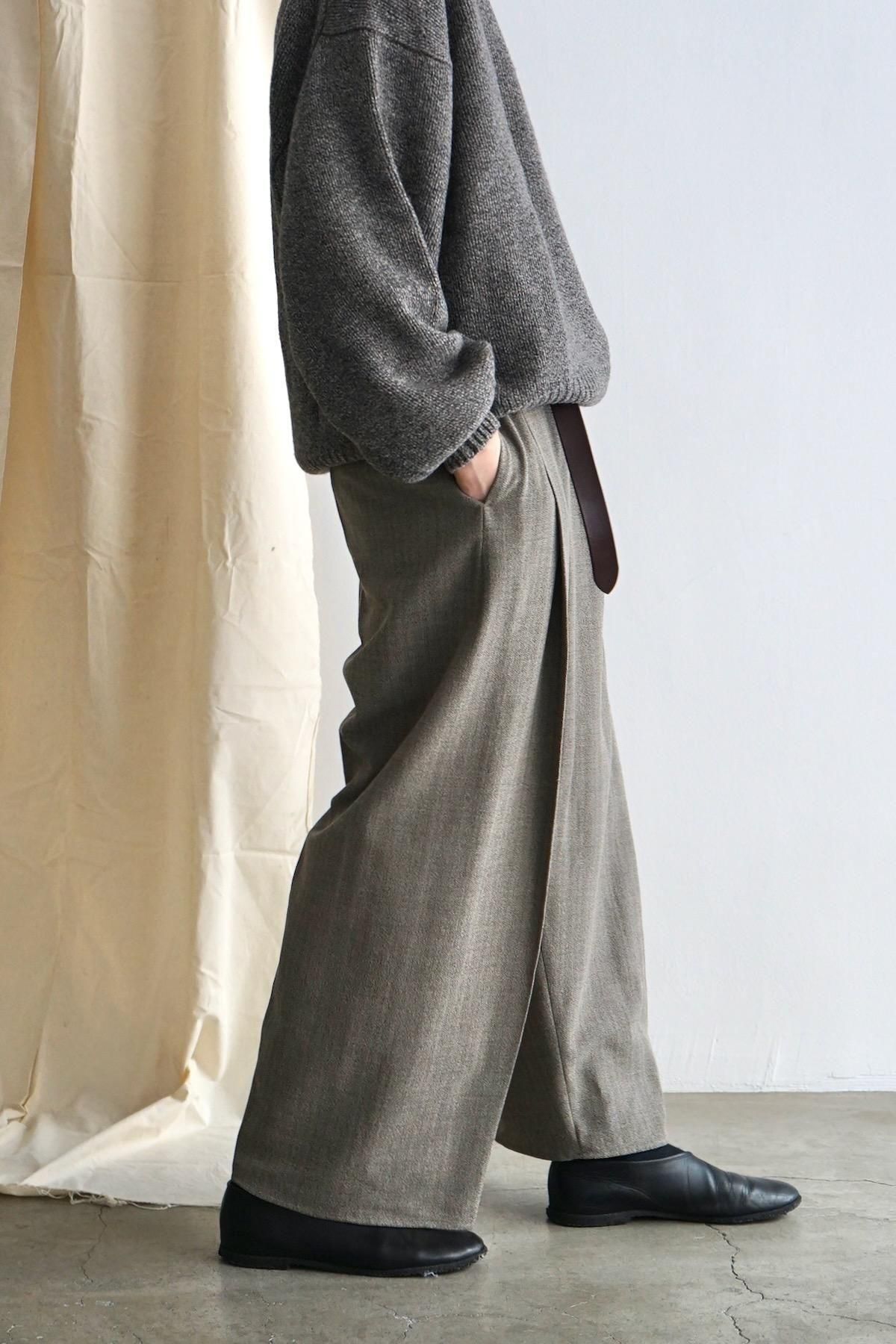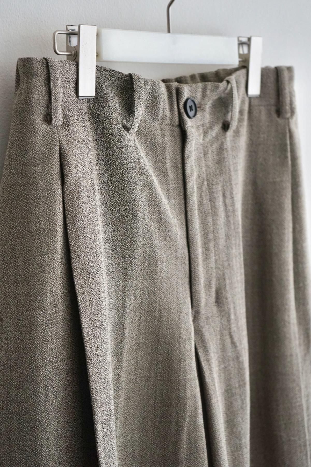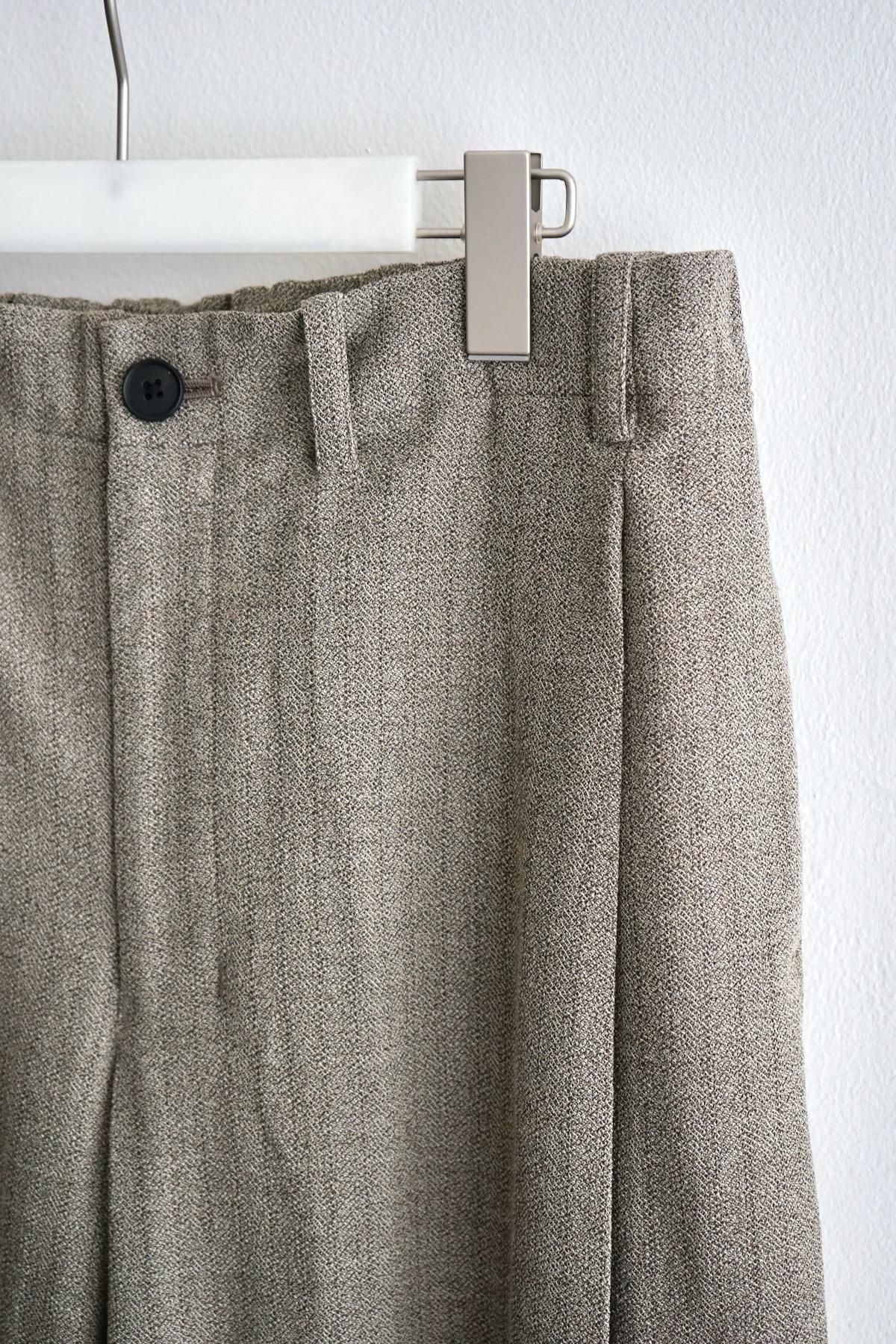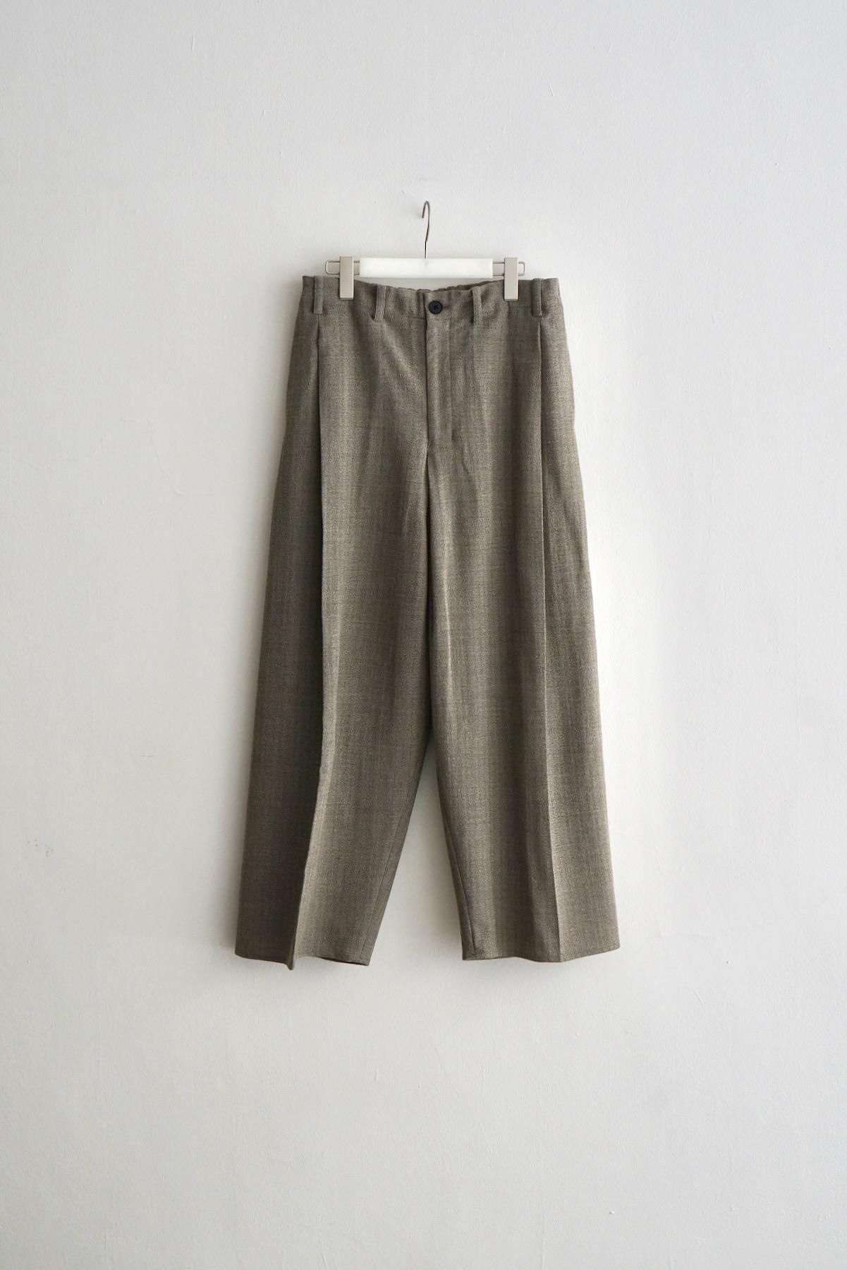 型は、股下にボックスプリーツのパターンを用いて、シルエットを出しております。脇線に縫い目が無いのが特徴で、一枚の布をより立体的に見せるために、股下にわたりを大量に確保ができるボックスプリーツを採用しております。1タックのデザインで、履くと真っ直ぐにストンと落ちるシルエットになっております。