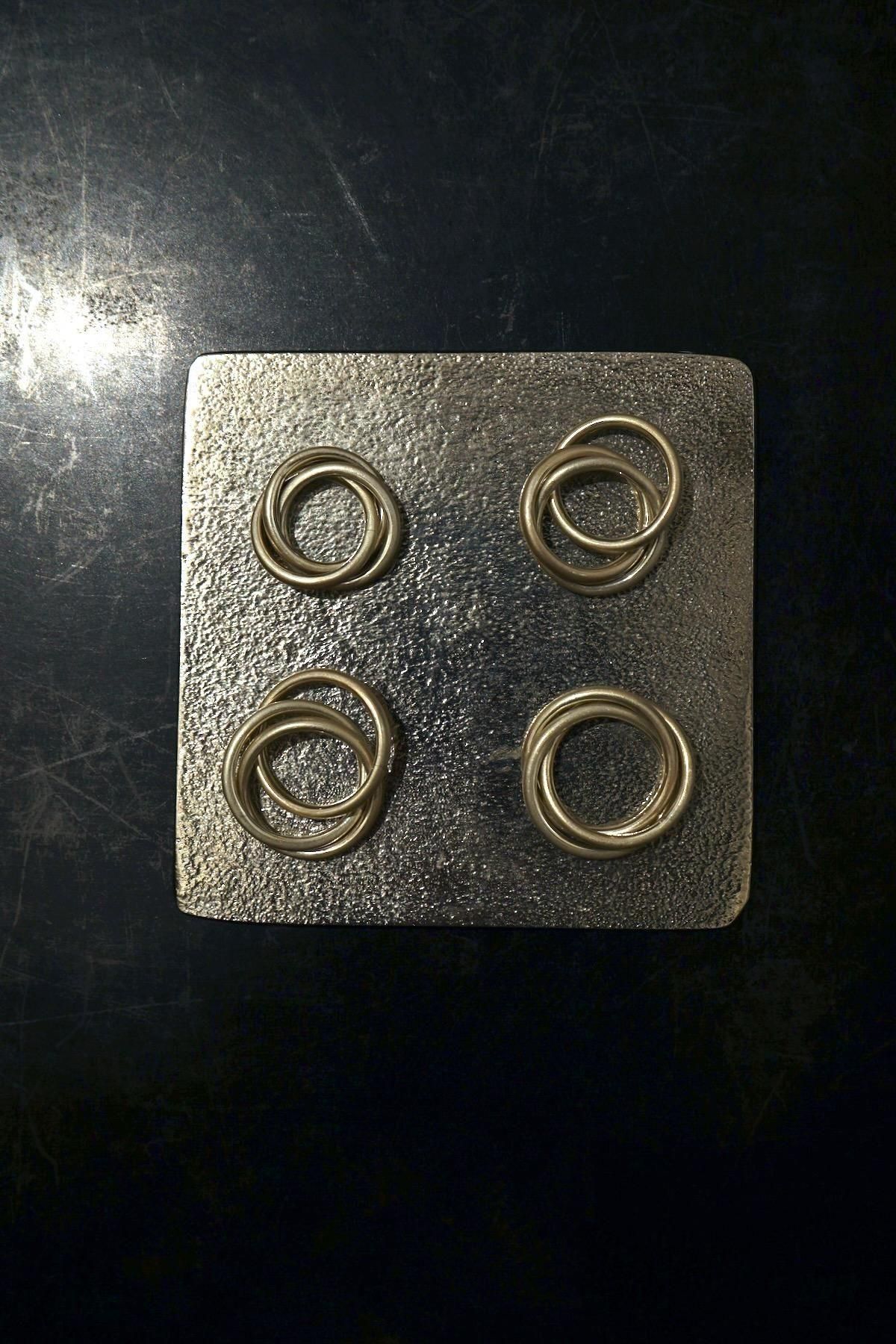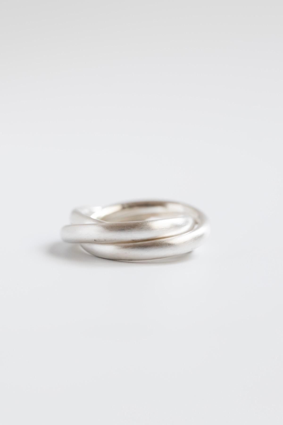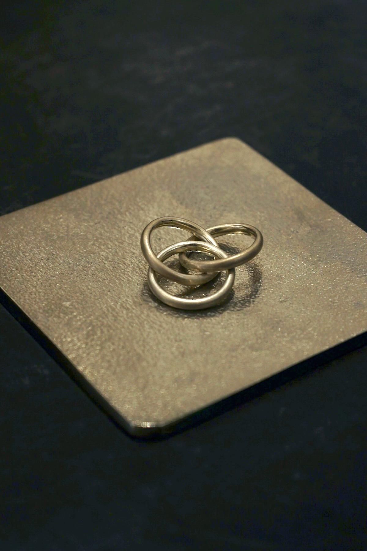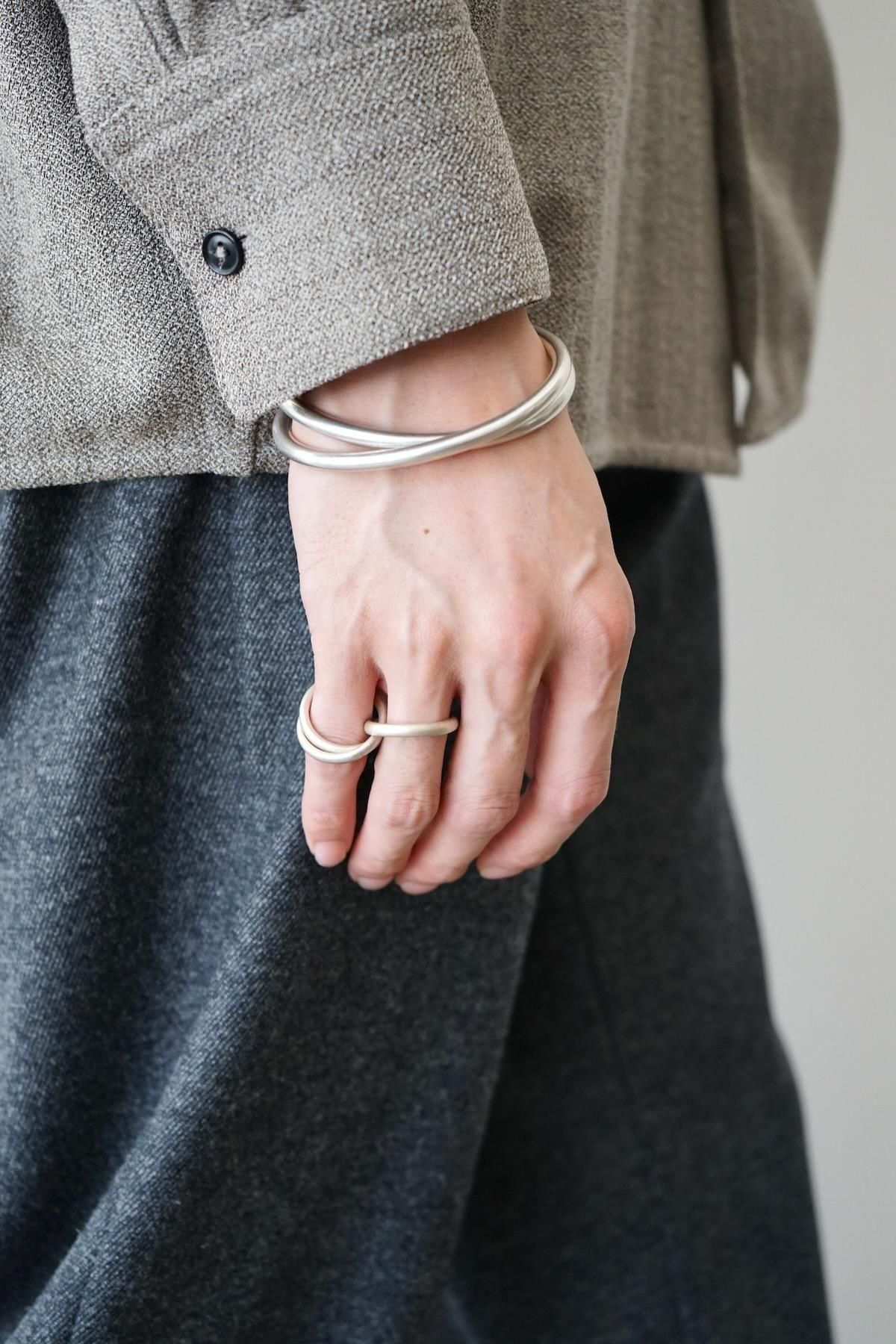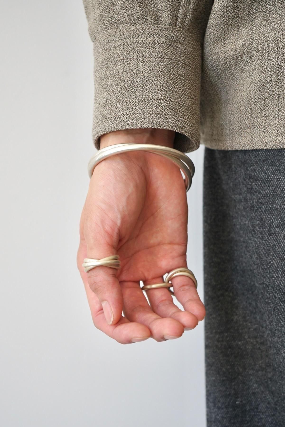一見シンプルながら、異なる構造の素材によって繊細なコントラストが生まれるコレクションです。片方は中空の薄いシルバー、もう片方は無垢のシルバーで構成されており、中空部分は着用を重ねることで凹みや歪みが生まれ、着用する方の生活を映し出すように、表情が変化していきます。