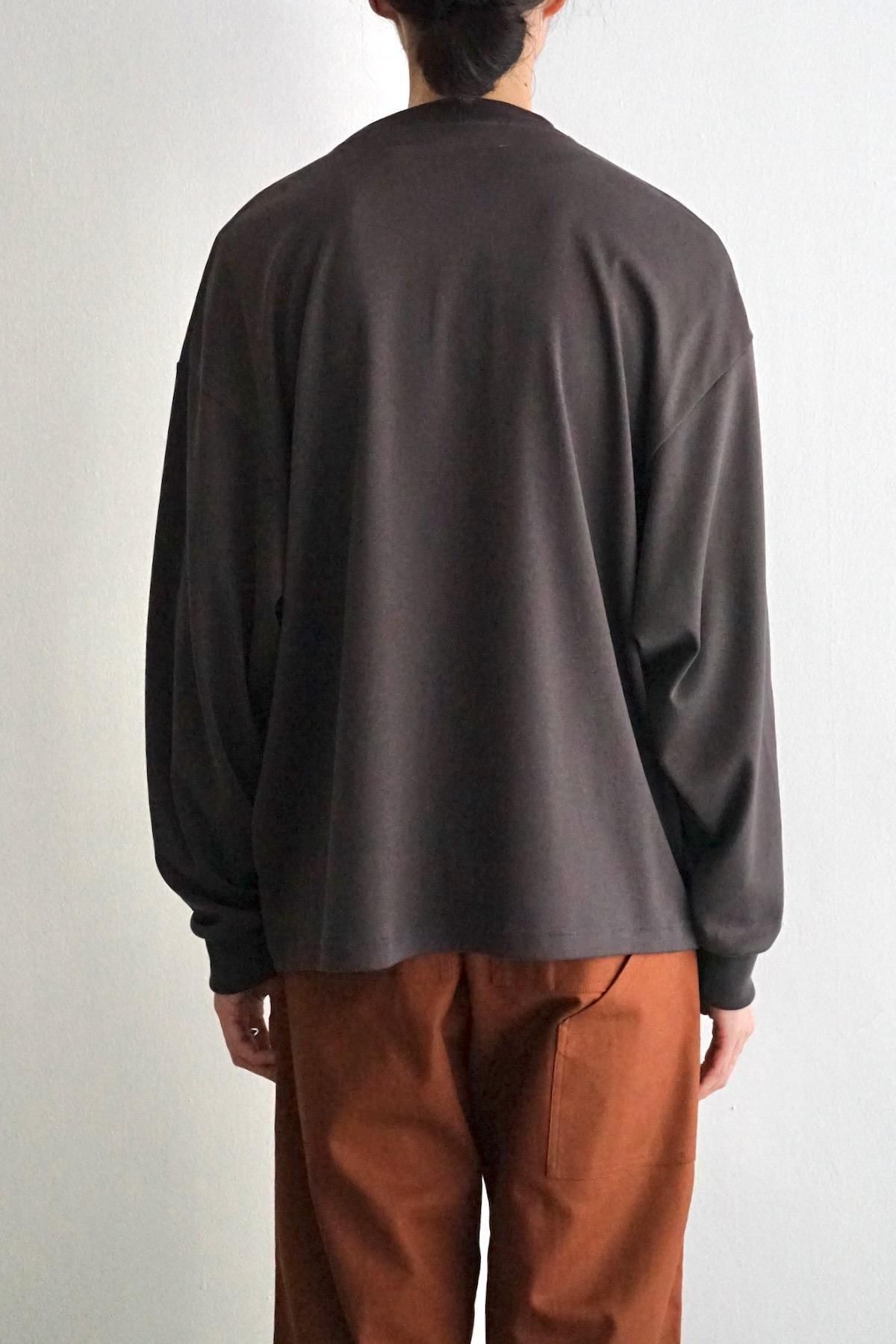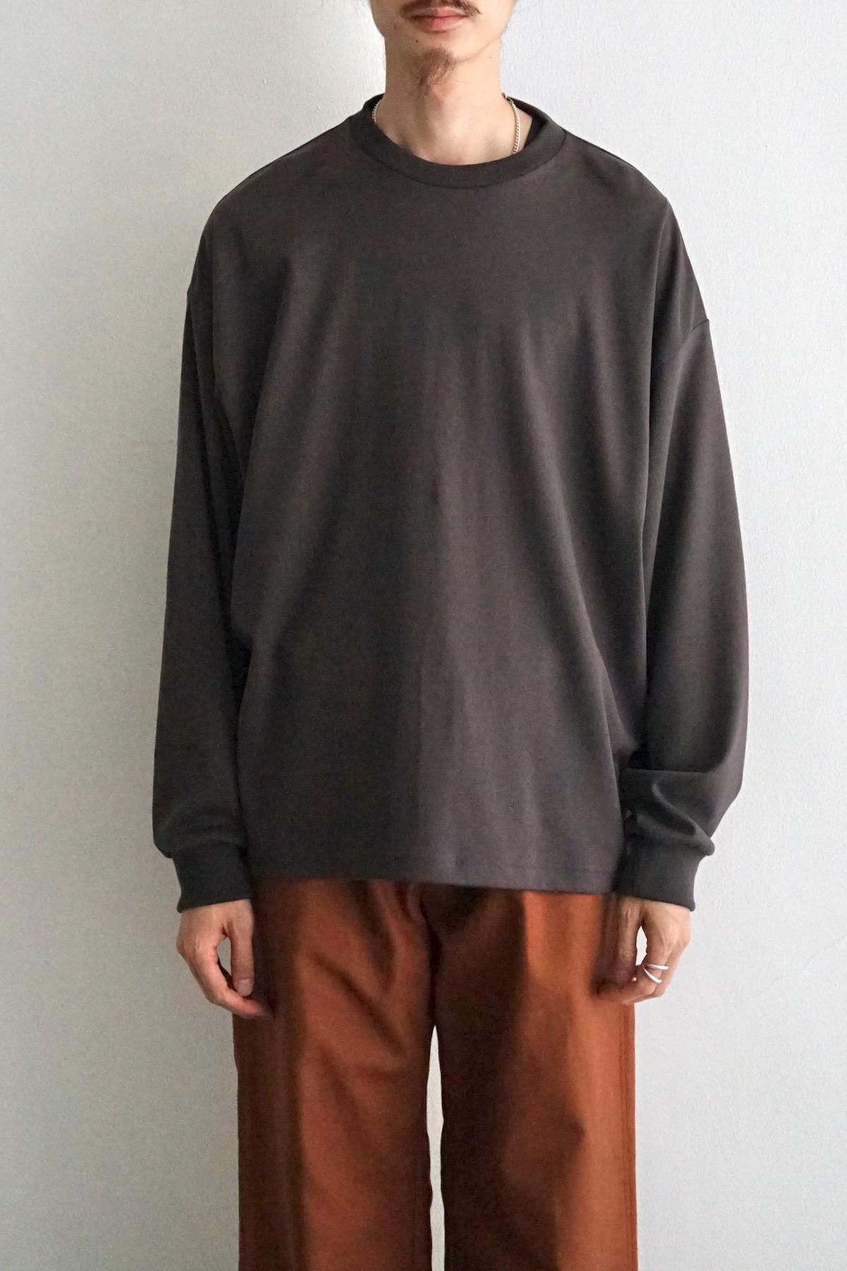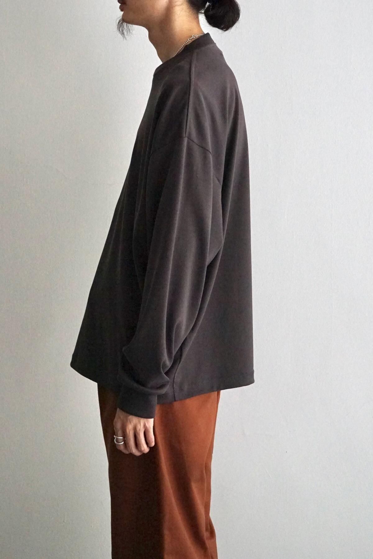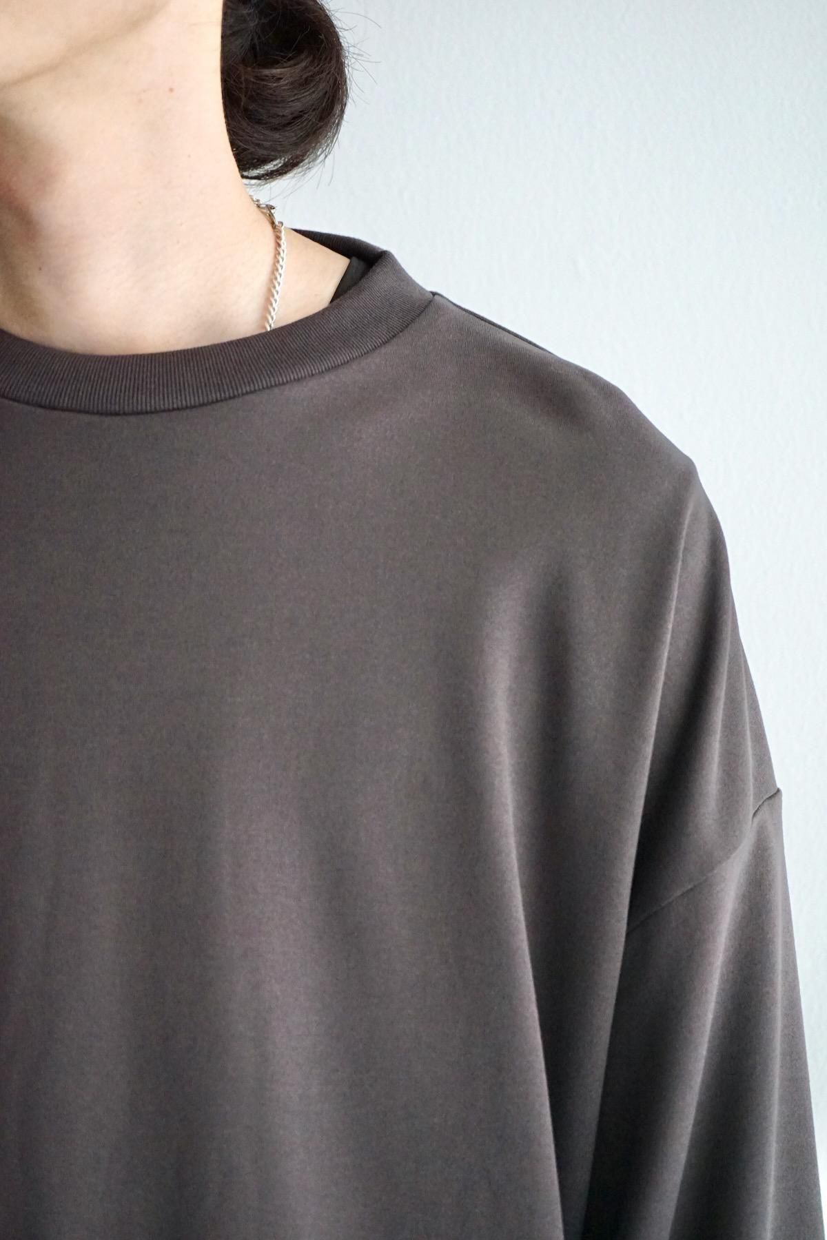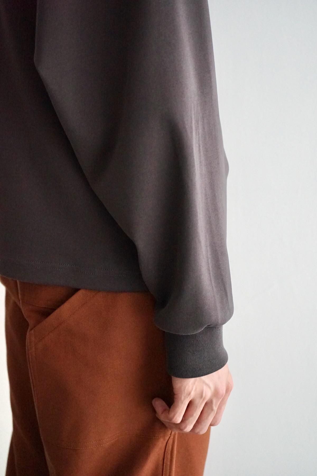 型は、オーバーサイズながらも裾に向けて大きくテーパードしたシルエットです。 裾周りに布がたまらぬ様、計算し分量を調整しています。 分量が大きくとられたアームホールから、ブルゾンの様な立体的な袖が付いているのが特徴です。 インナーとしての解釈ではなく、一枚で着用しても様になり、プルオーバーのようにも着用出来る、そんなロンTを目指しています。