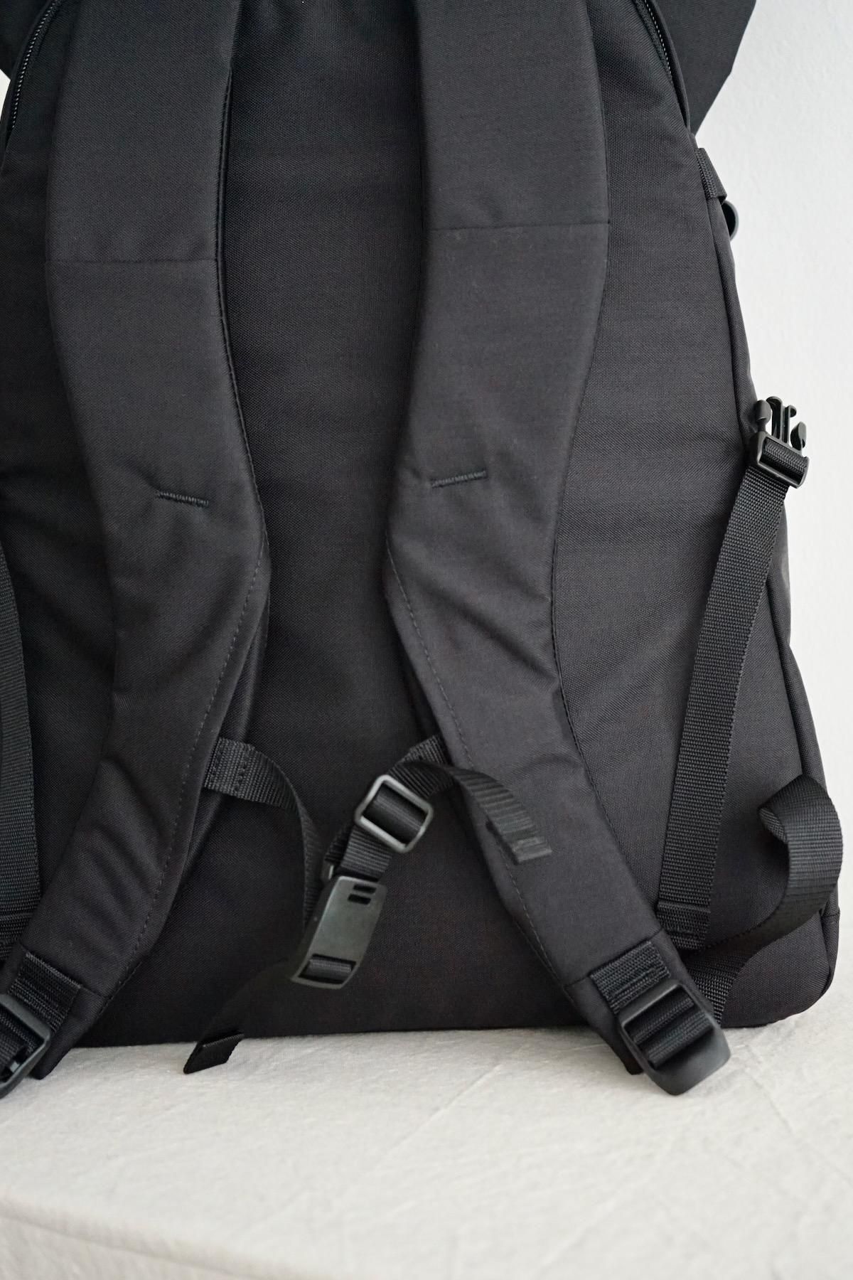 背面からメイン収納部にショートカットできるファスナーやチェストストラップのショルダー周りのパーツなど特徴的な機能は比翼によって覆い隠されています。