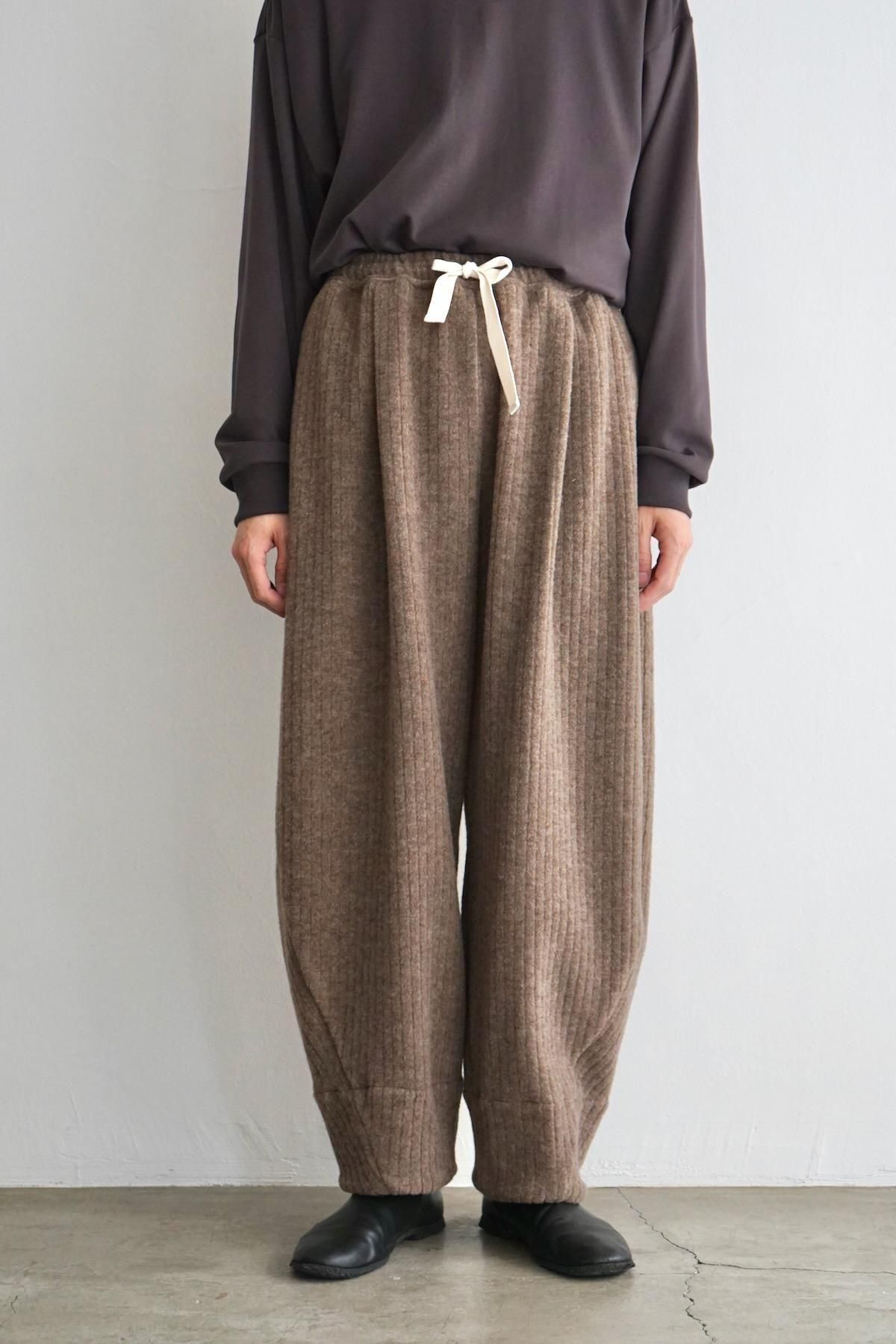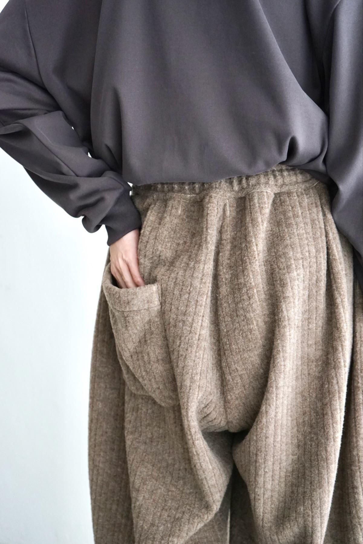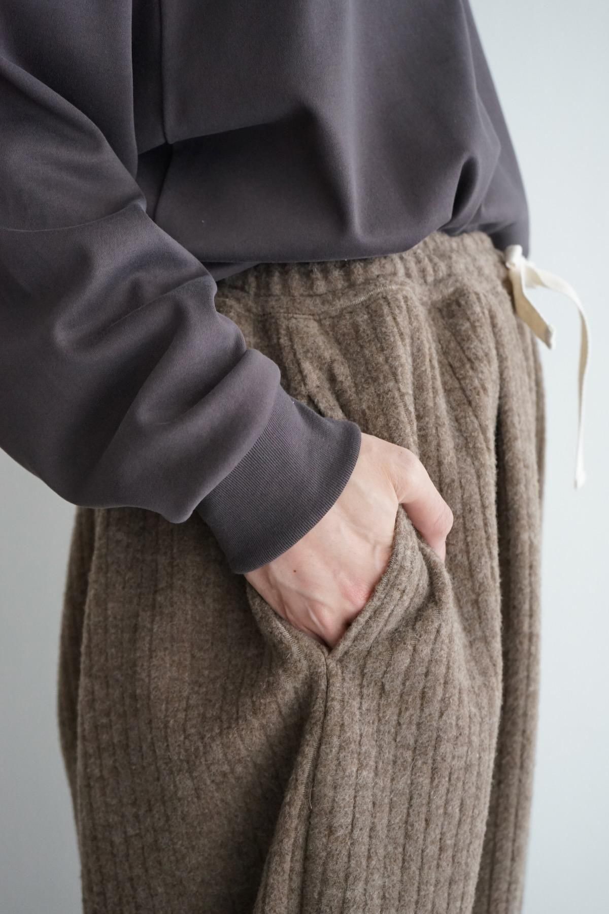 ニットで制作したことにより、ヴィンテージのやや腰の抜けた落ち感としなやかさが表現され、また、ジャージーのような伸縮と無染色糸による軽さを兼ね備えた、リラックスした着用感となりました。