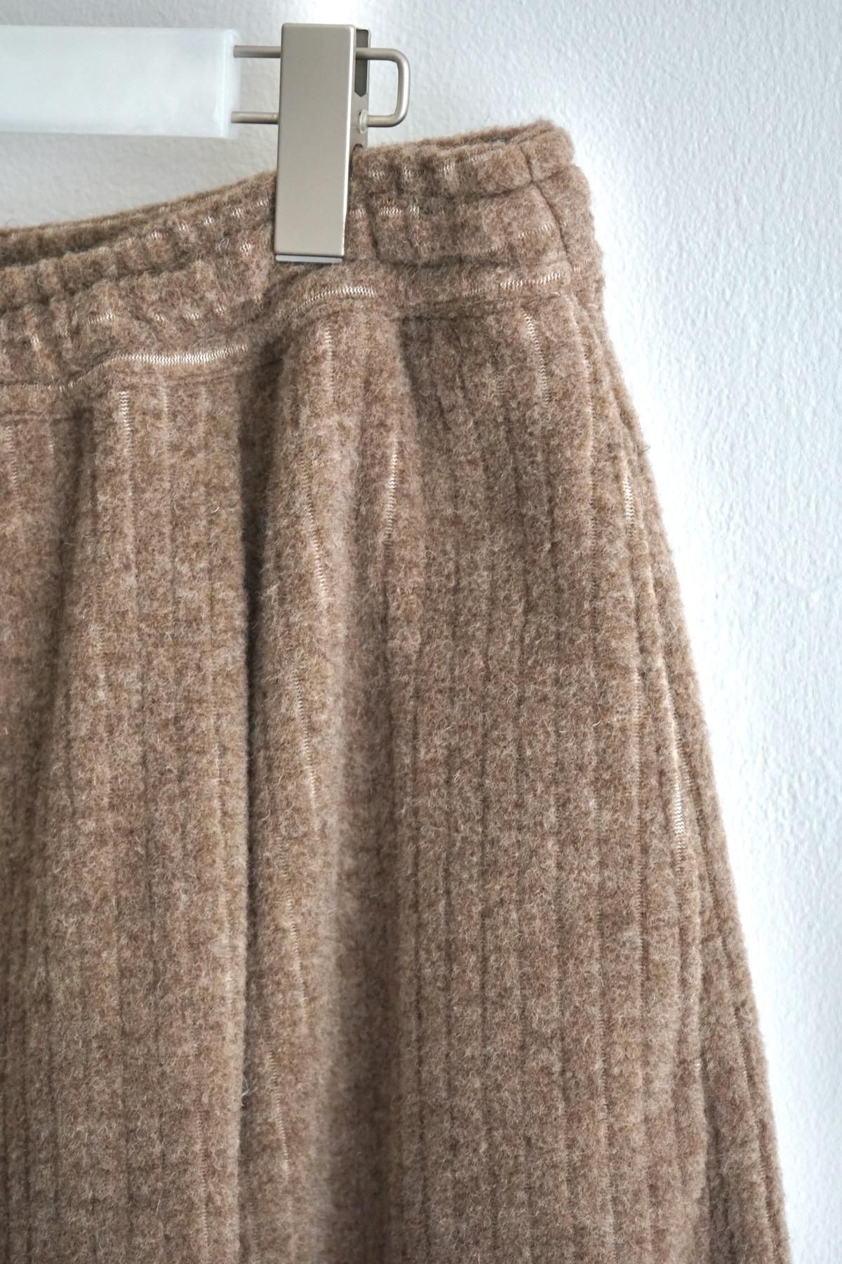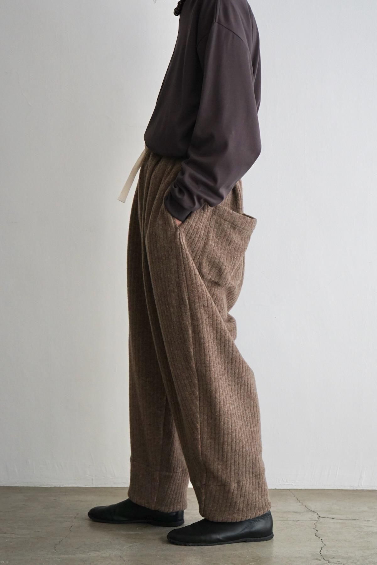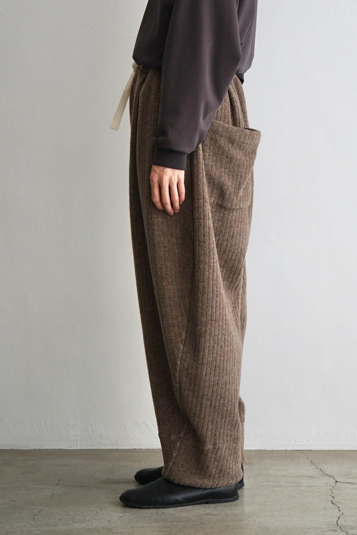 ニットで制作したことにより、ヴィンテージのやや腰の抜けた落ち感としなやかさが表現され、また、ジャージーのような伸縮と無染色糸による軽さを兼ね備えた、リラックスした着用感となりました。
